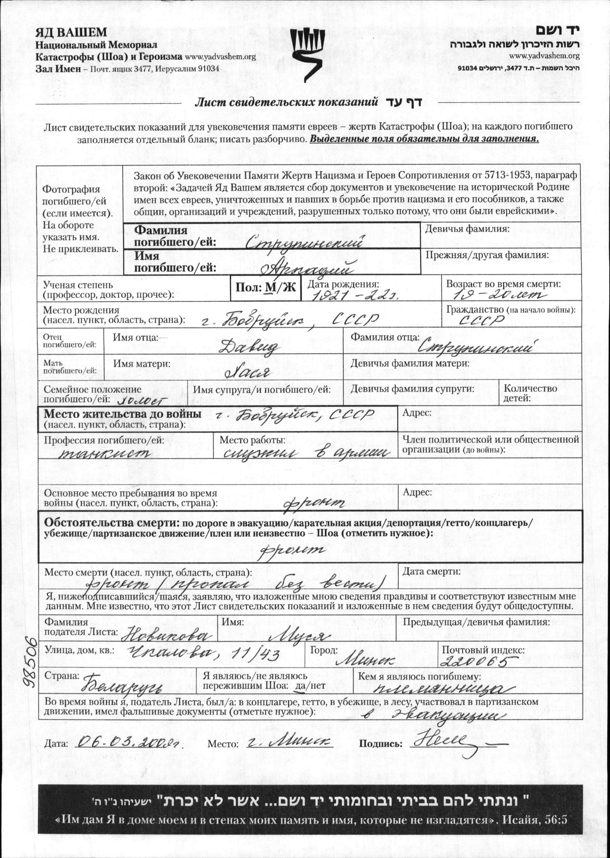 Arkadii Strupinski wurde im Jahr 1922 in Bobruysk, Weißrussland (UdSSR) geboren. Er war der Sohn von David und Khasya. Er war Militär und Ledig. Vor dem Zweiten Weltkrieg lebte er in Bobruysk, Weißrussland (UdSSR). Während des Krieges war er in die Sowjetischen Streitkräfte.