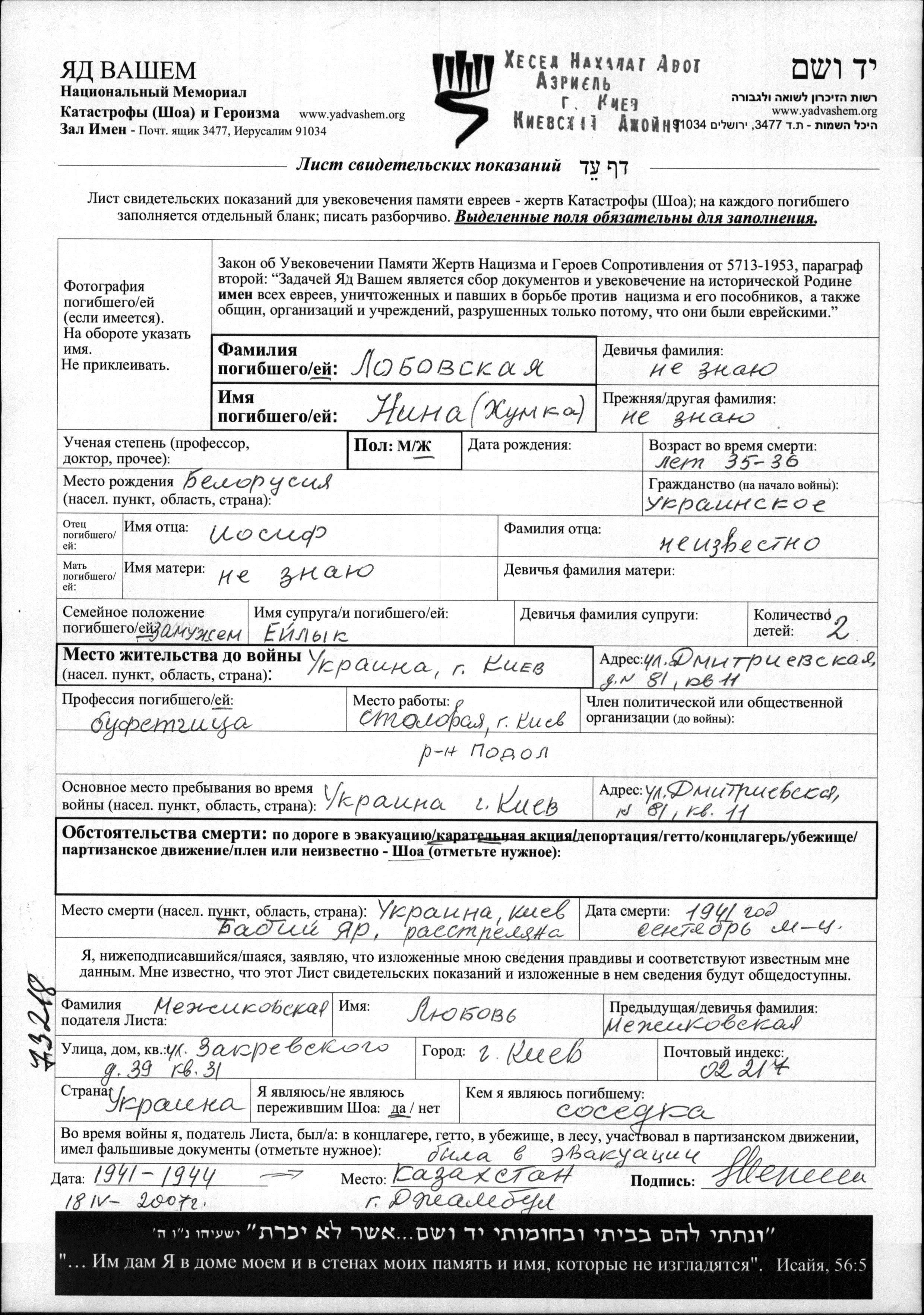 Nina Khumka Lobovskaya wurde in Weißrussland (UdSSR) geboren. Sie war die Tochter von Iosif. Sie war Buffet worker und mit Eylyk Verheiratet. Vor dem Zweiten Weltkrieg lebte sie in Kiev, Ukraine (UdSSR). Während des Krieges war sie in Kiev, Ukraine (UdSSR).