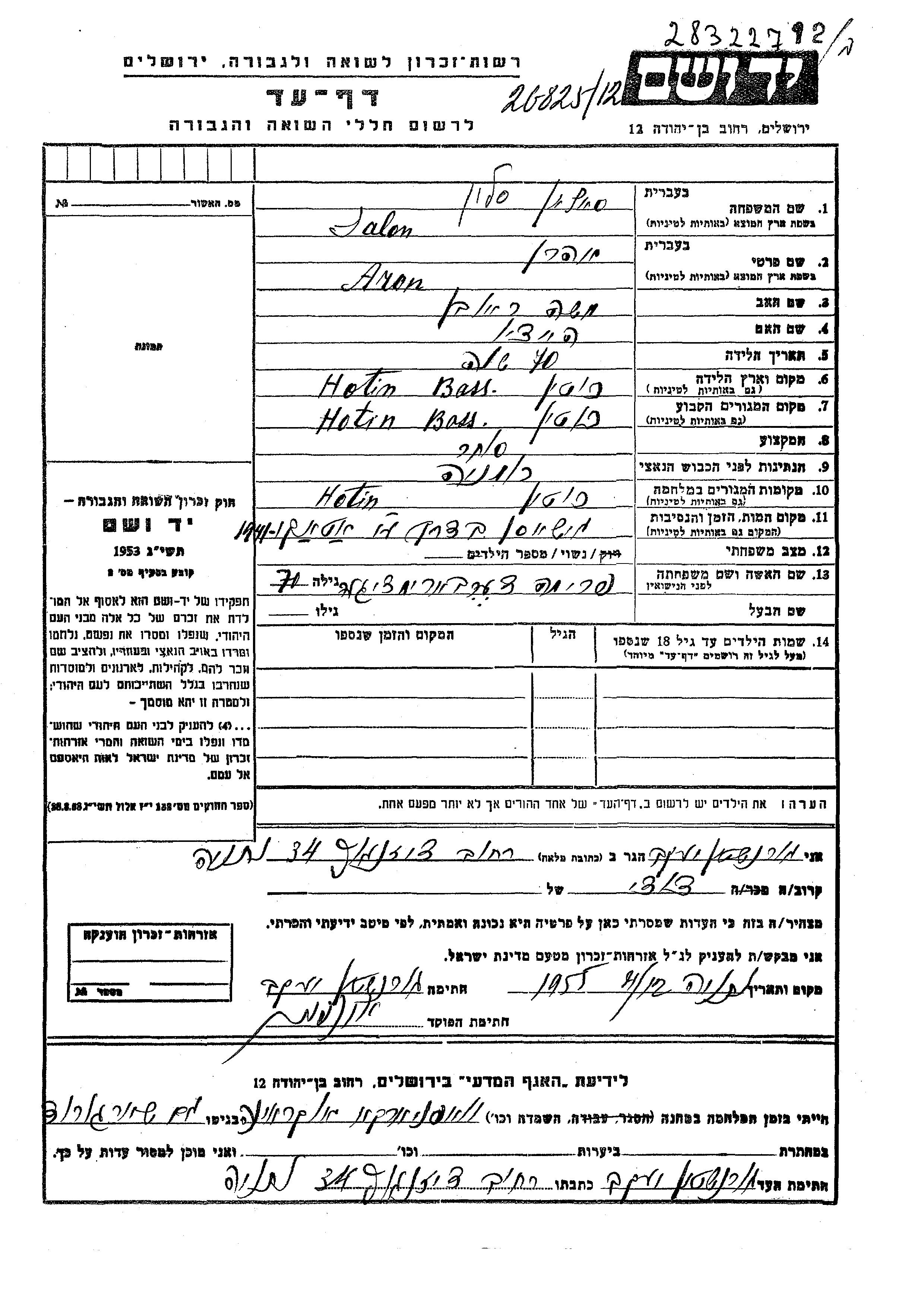 Aron Reuven Salon wurde in Hotin, Rumänien geboren. Er war der Sohn von Moshe und Haiztio. Er war Kaufmann/-frau und mit Frima, geb. Derbaremdeger Verheiratet. Vor dem Zweiten Weltkrieg lebte er in Hotin, Rumänien. Während des Krieges war er in Hotin, Rumänien.
