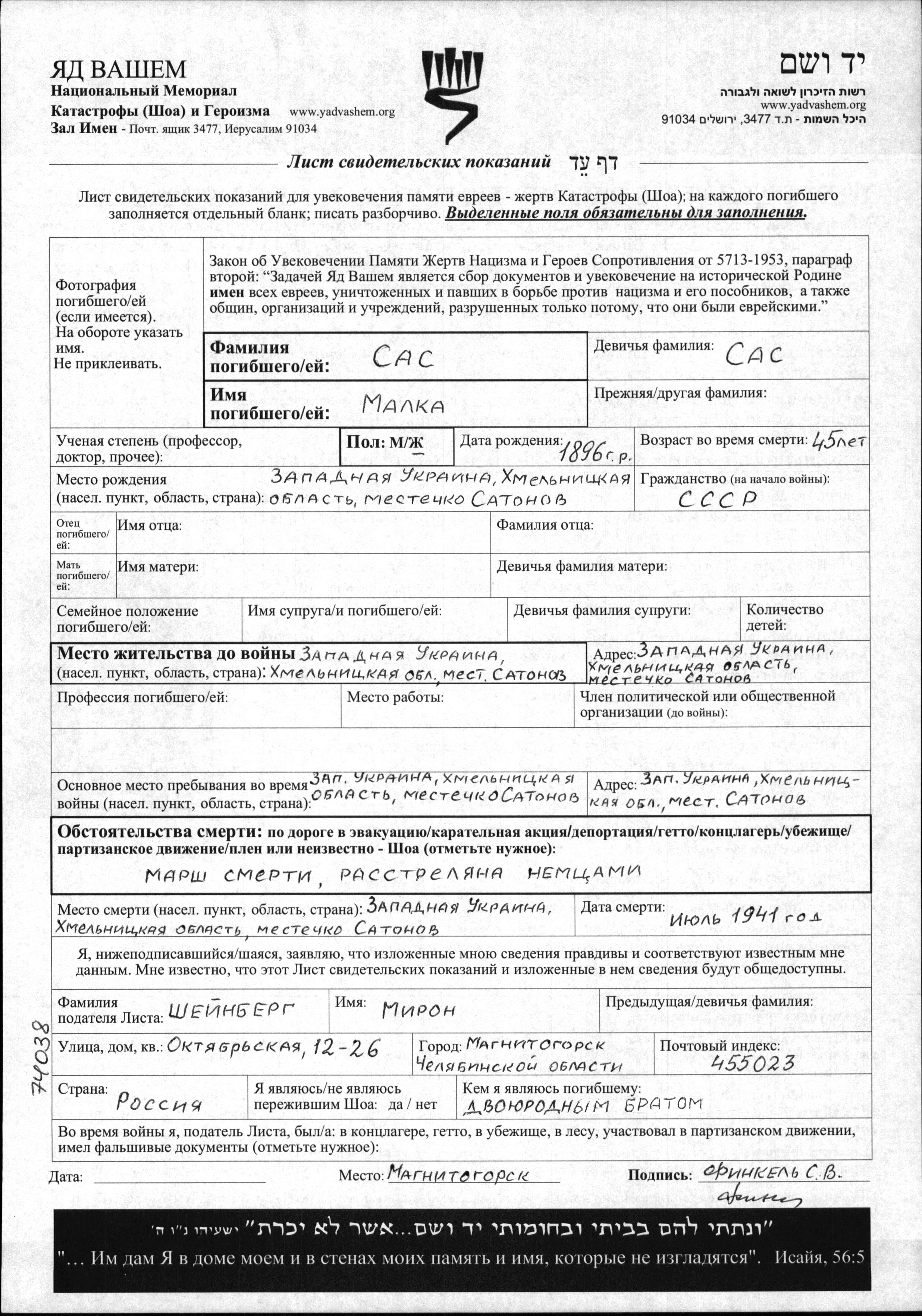 Malka Sas wurde im Jahr 1896 in Satanov, Ukraine (UdSSR) geboren. Vor dem Zweiten Weltkrieg lebte sie in Satanov, Ukraine (UdSSR). Während des Krieges war sie in Satanov, Ukraine (UdSSR).