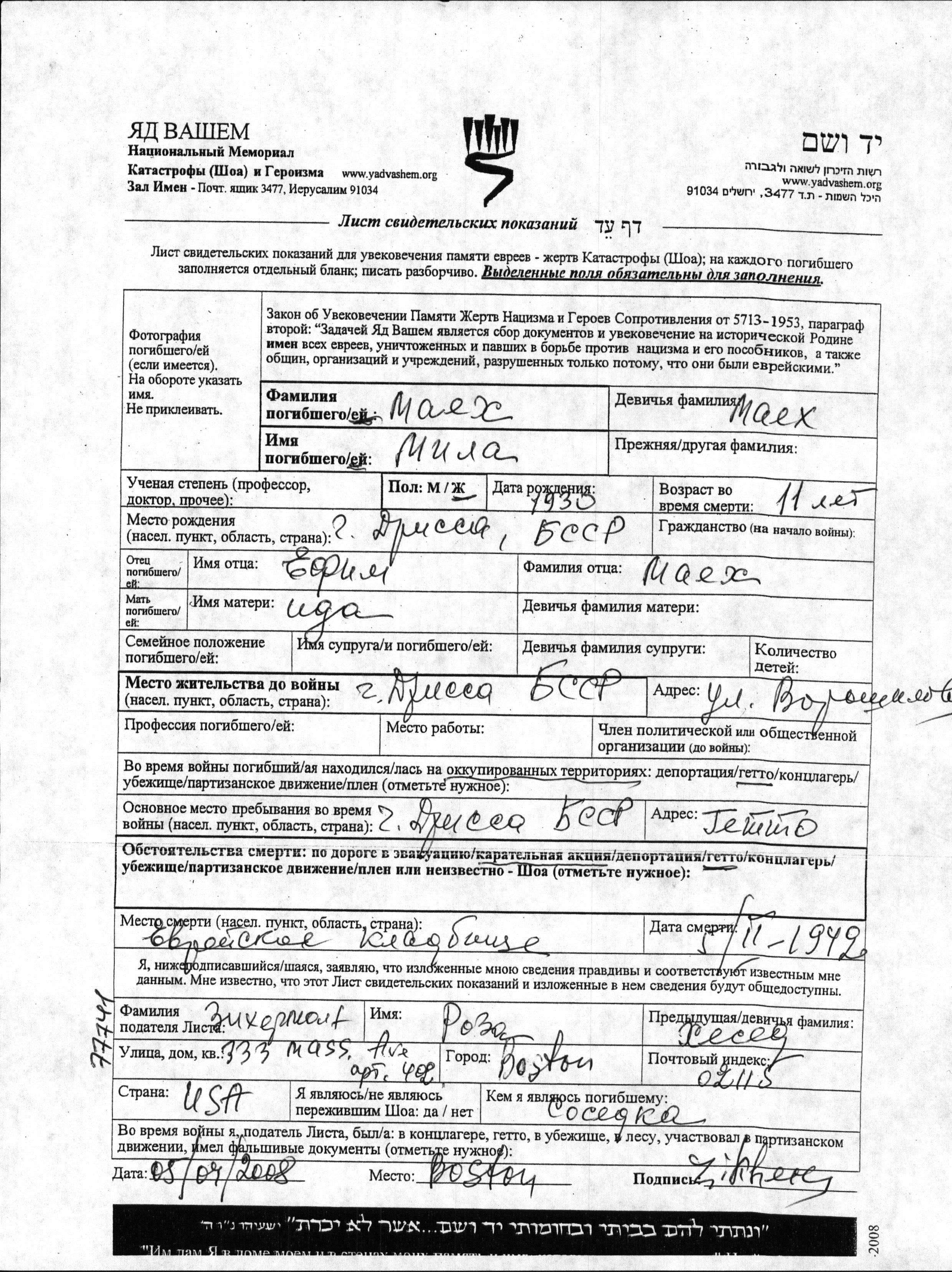 Mila Mayekh wurde im Jahr 1930 in Drissa, Weißrussland (UdSSR) geboren. Sie war die Tochter von Yefim und Ida. Sie war Kind. Vor dem Zweiten Weltkrieg lebte sie in Drissa, Weißrussland (UdSSR). Während des Krieges war sie in Drissa, Weißrussland (UdSSR).