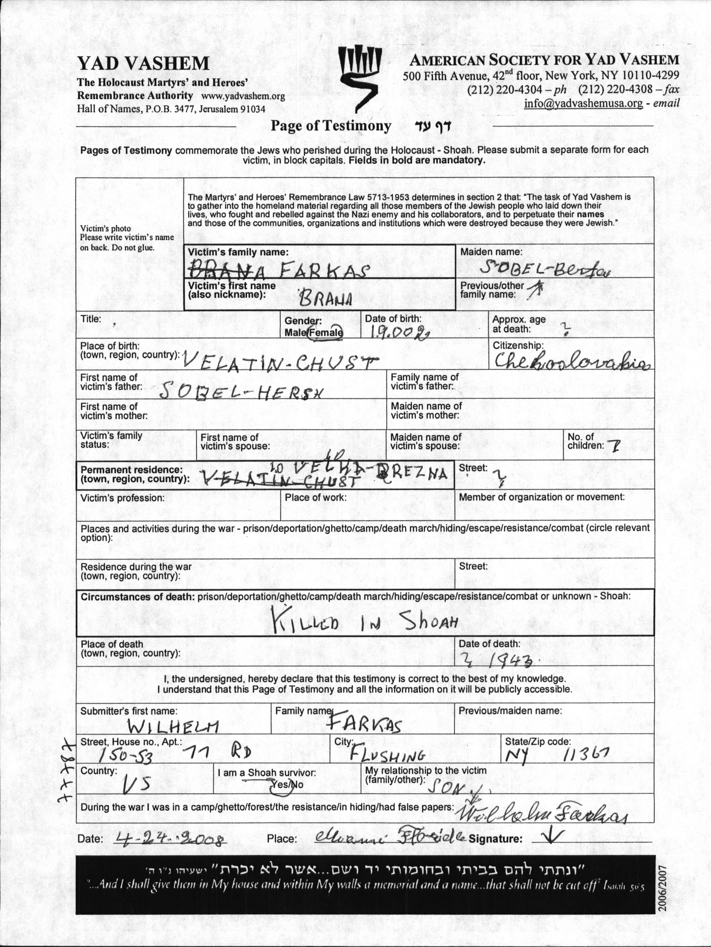 Brana Berta Farkas, geb. Sobel wurde im Jahr 1902 in Velatin, Tschechoslowakei geboren. Sie war die Tochter von Hersh. Sie war Verheiratet. Vor dem Zweiten Weltkrieg lebte sie in Velka Berezna, Tschechoslowakei.