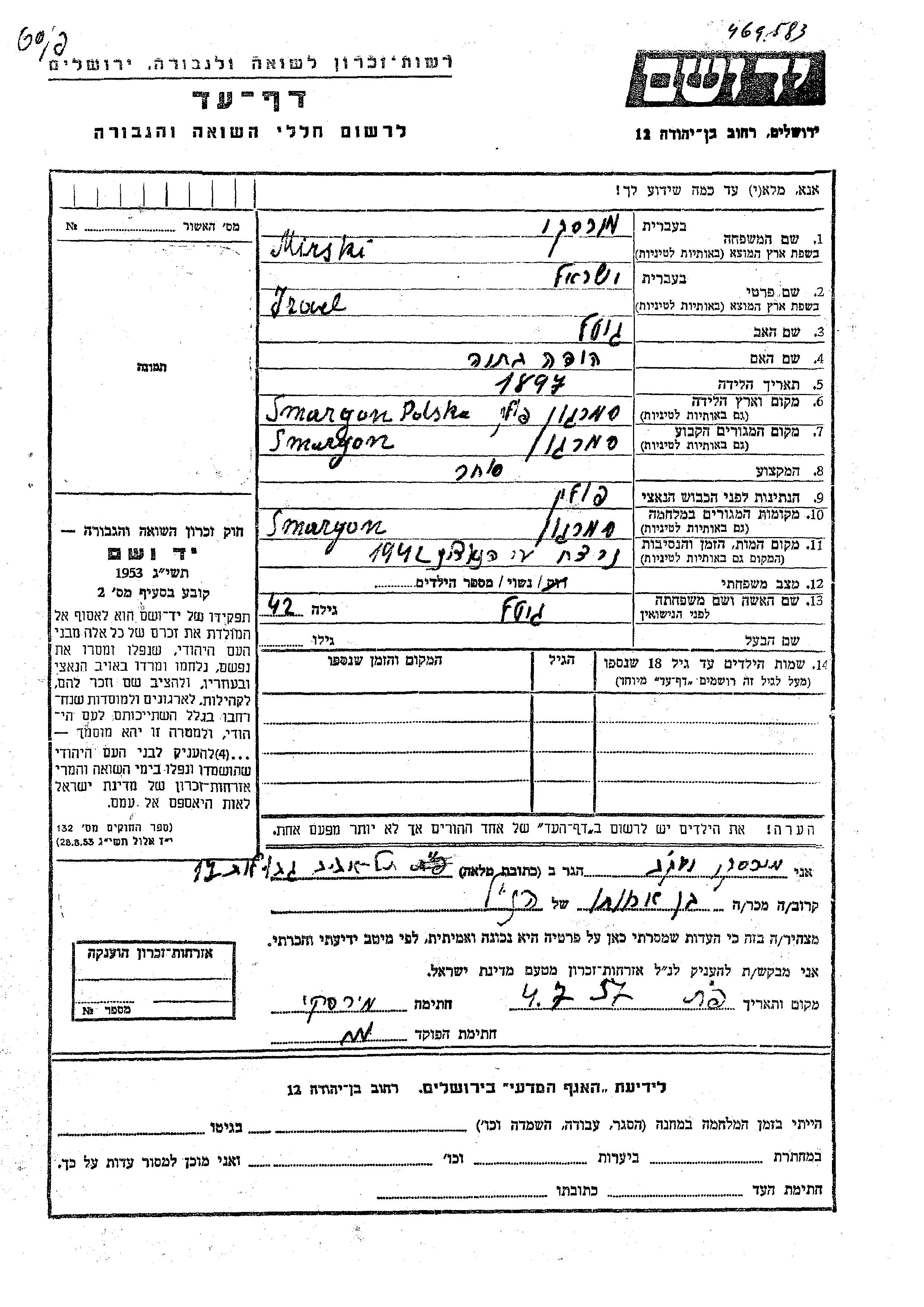 Izrael Mirski wurde im Jahr 1897 in Smargon, Polen geboren. Er war der Sohn von Gitel und Hoda Batia. Er war Kaufmann/-frau und mit Gitel Verheiratet. Vor dem Zweiten Weltkrieg lebte er in Smargon, Polen. Während des Krieges war er in Smargon, Polen.