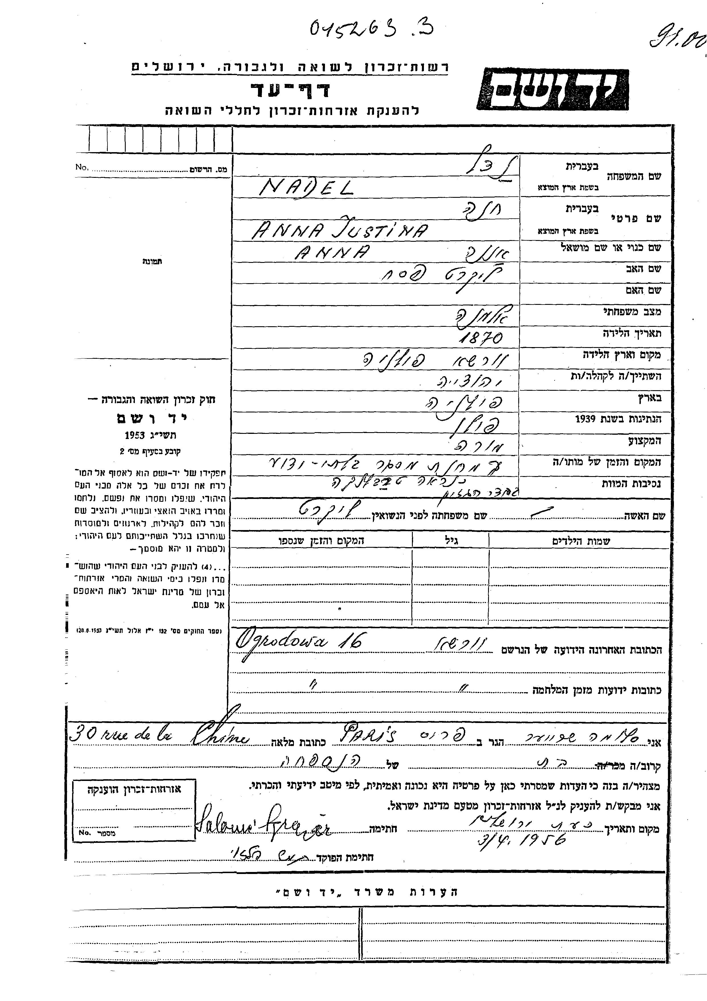 Anna Justina Khana Nadel, geb. Likert wurde im Jahr 1870 in Warszawa, Polen geboren. Sie war die Tochter von Pesakh. Sie war Lehrer/in und Witwe. Vor dem Zweiten Weltkrieg lebte sie in Warszawa, Polen. Während des Krieges war sie in Warszawa, Polen.