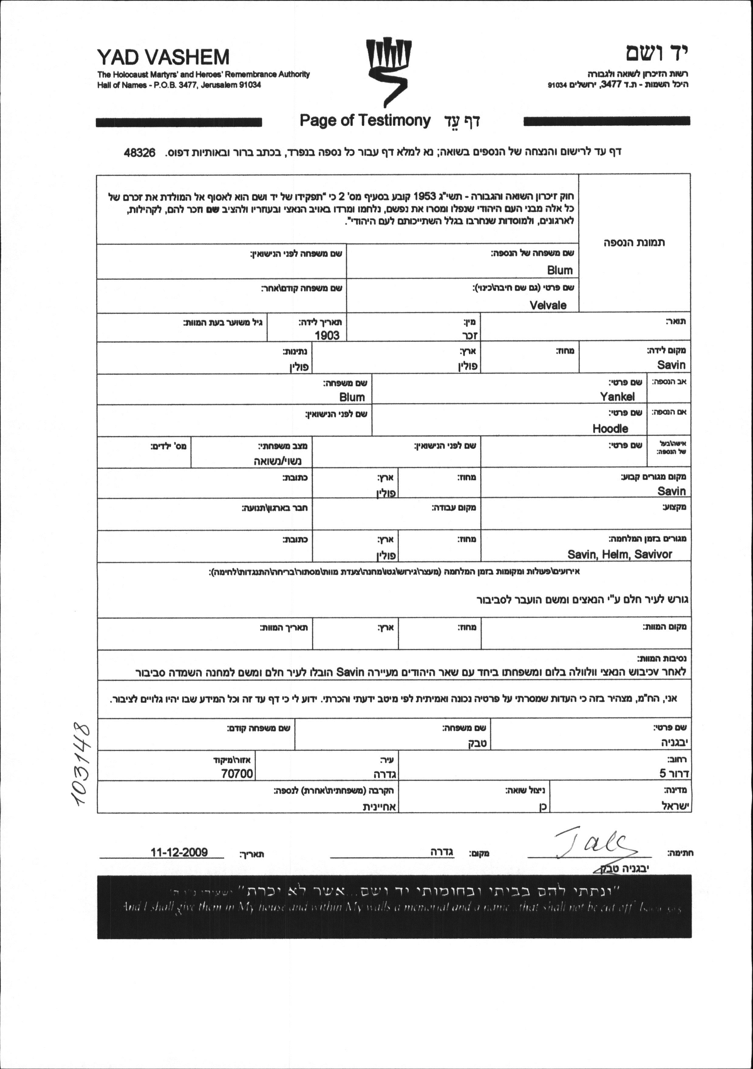 Velvale Blum wurde im Jahr 1903 in Savin, Polen geboren. Er war der Sohn von Yankel und Hodle. Er war Verheiratet. Vor dem Zweiten Weltkrieg lebte er in Savin, Polen. Während des Krieges war er in Chelm, Polen.