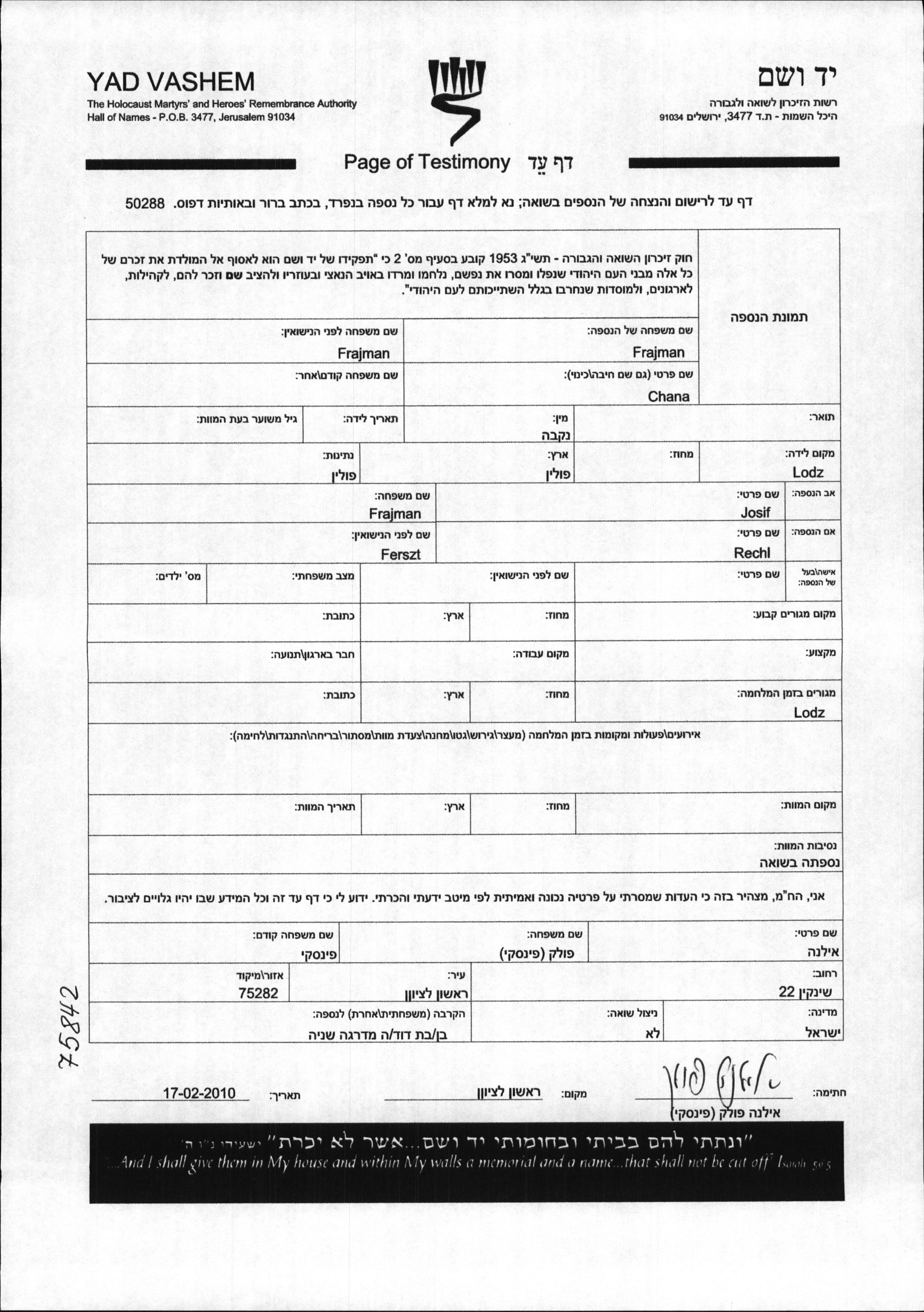 Chana Frajman, geb. Frajman wurde in Lodz, Polen geboren. Sie war die Tochter von Josif und Rechl, geb. Ferszt. Vor dem Zweiten Weltkrieg lebte sie in Lodz, Polen. Während des Krieges war sie in Lodz, Polen.