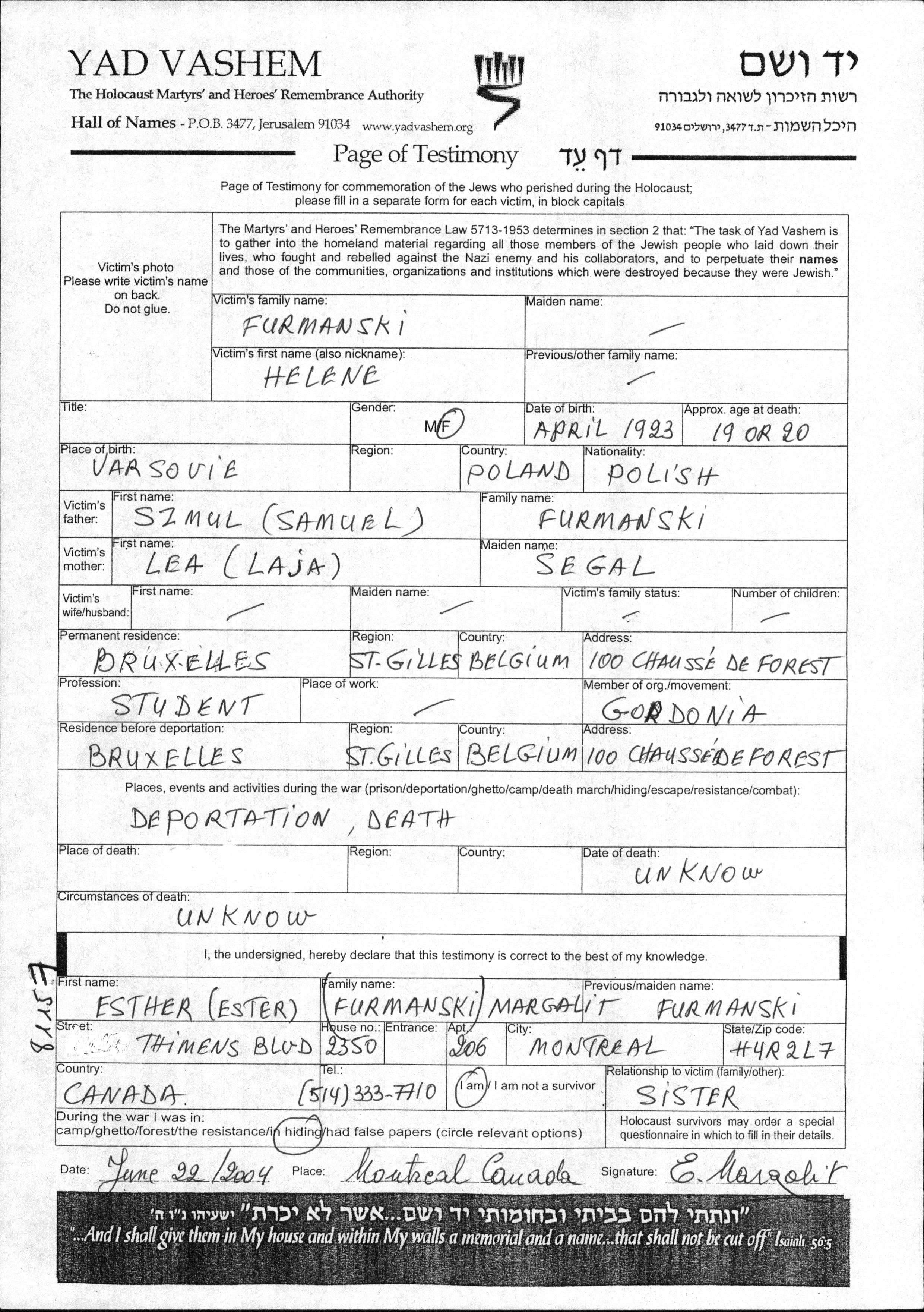 Helene Furmanski wurde im Jahr 1923 in Varsovie, Polen geboren. Sie war die Tochter von Szmil und Lea, geb. Segal. Sie war Student und Ledig. Vor dem Zweiten Weltkrieg lebte sie in Bruxelles, Belgien. Während des Krieges war sie in Bruxelles, Belgien.