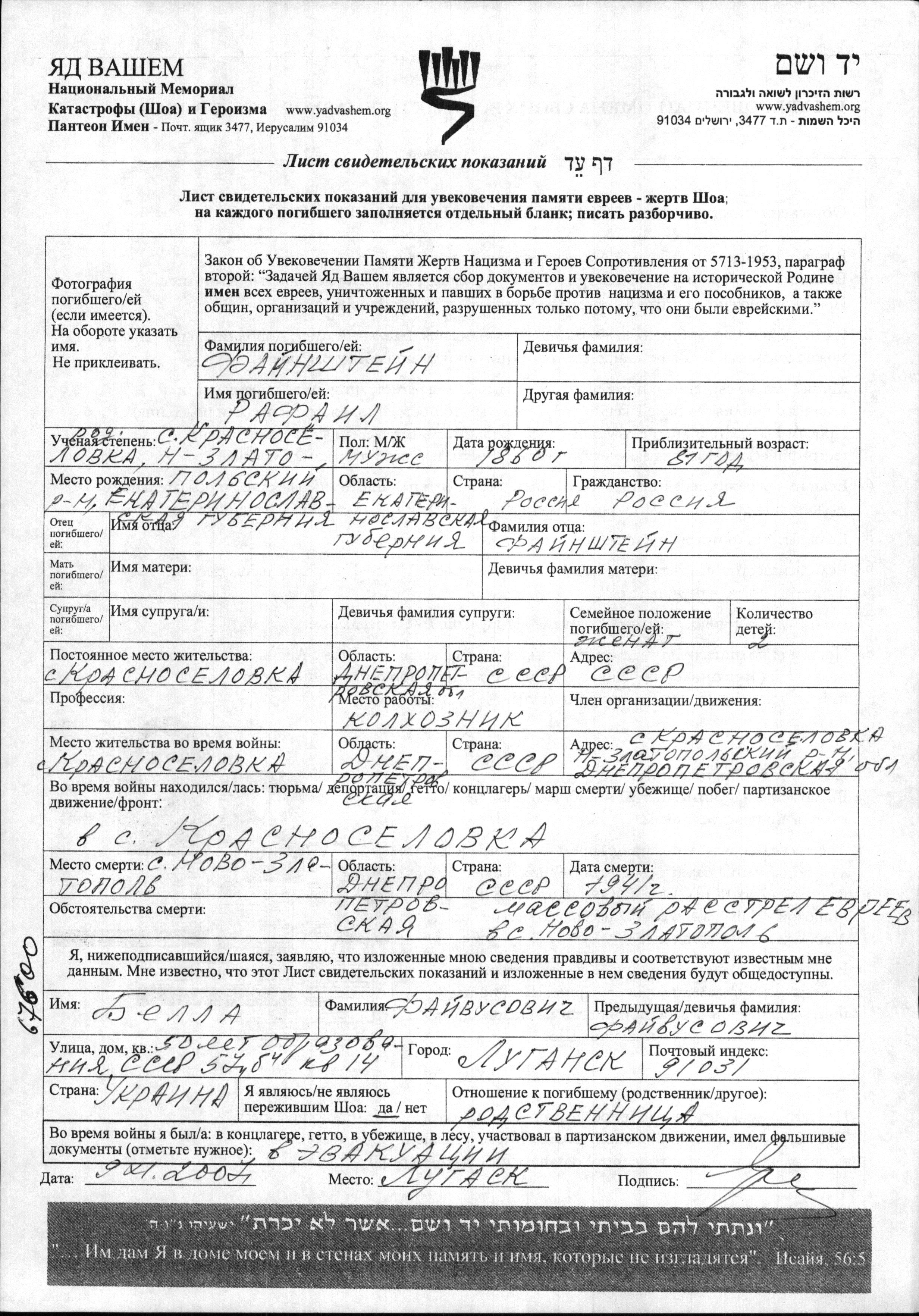 Rafail Faynshteyn wurde im Jahr 1860 in Krasnoselovka, Ukraine (UdSSR) geboren. Er war Kolchosbauer/-bäuerin und Verheiratet. Vor dem Zweiten Weltkrieg lebte er in Krasnoselovka, Ukraine (UdSSR). Während des Krieges war er in Krasnoselovka, Ukraine (UdSSR).