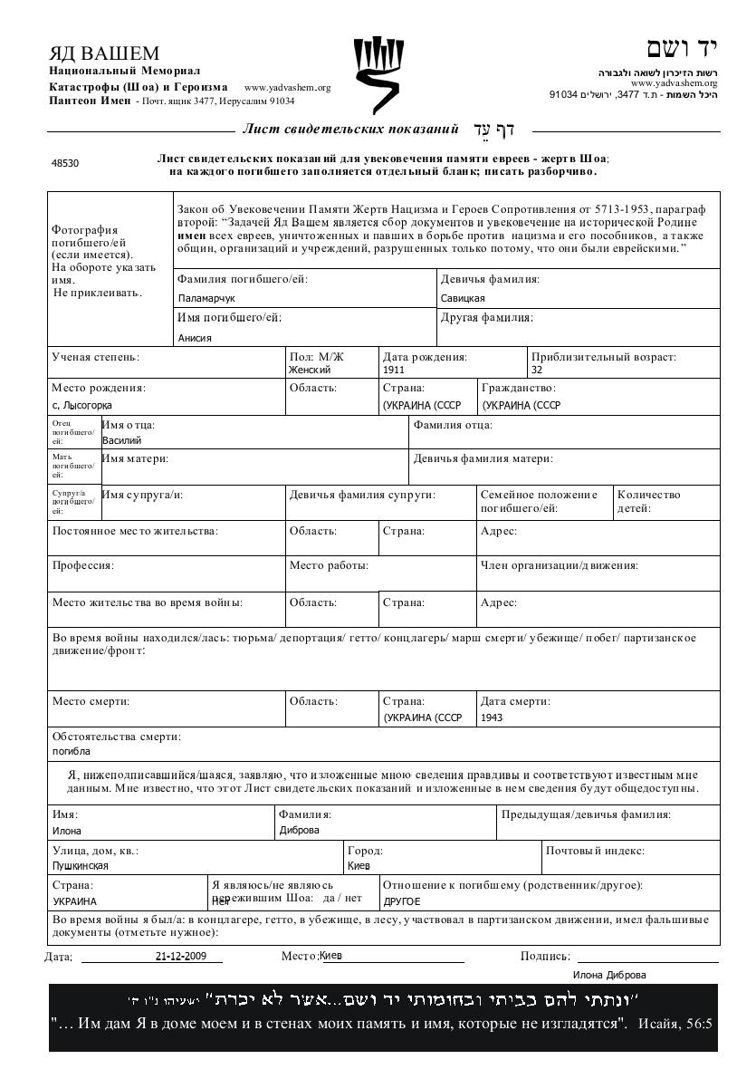 Anisiya wurde in der Schoah ermordet. Todesort: Ukraine (UdSSR) im Jahr 1943.