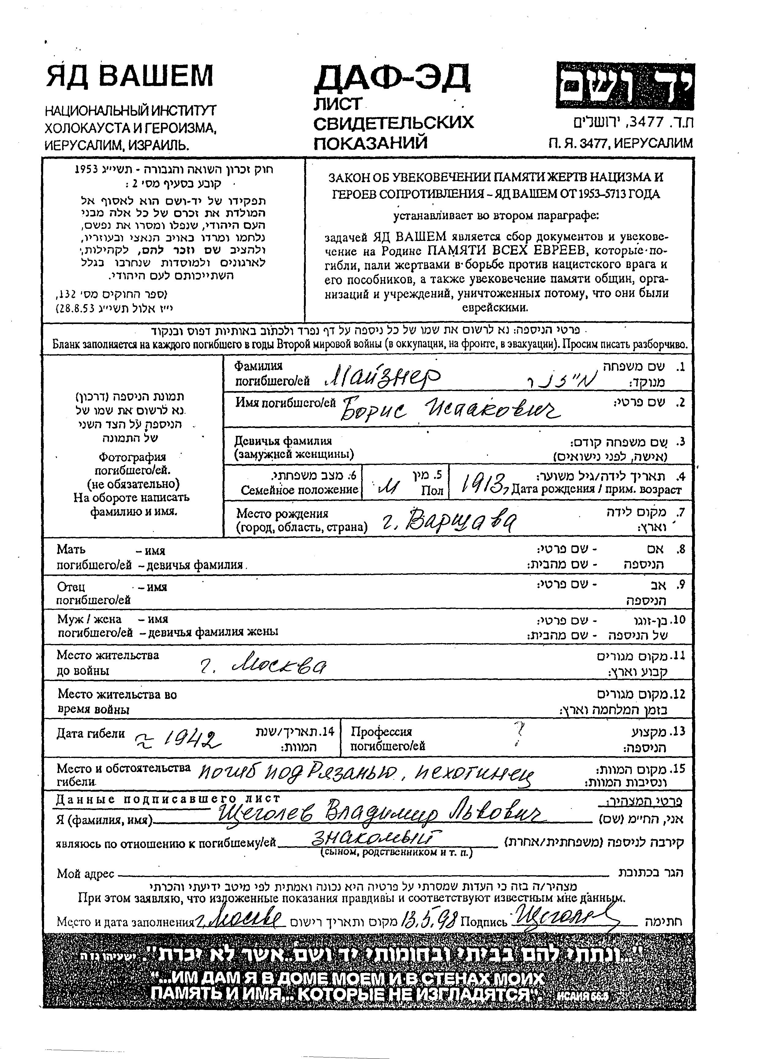 Boris Meizner wurde im Jahr 1913 in Warsaw, Polen geboren. Er war der Sohn von Isaak. Vor dem Zweiten Weltkrieg lebte er in Moskva, Russland (UdSSR).