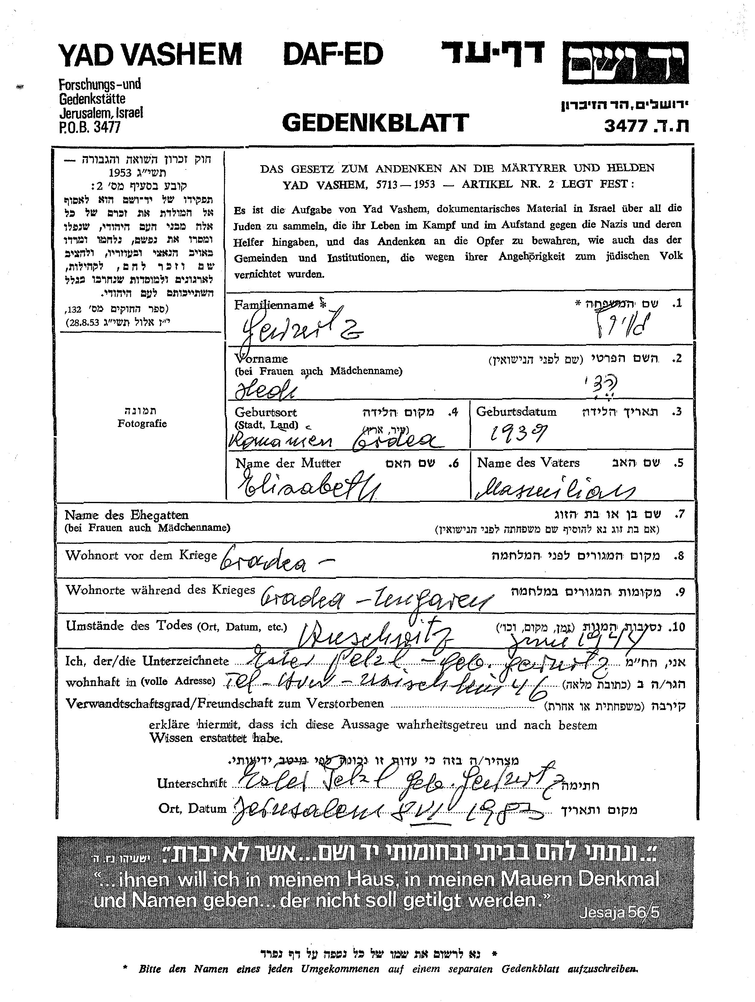 Gewirtz Hedi 1939 Oradea, Rumänien Gedenkblatt