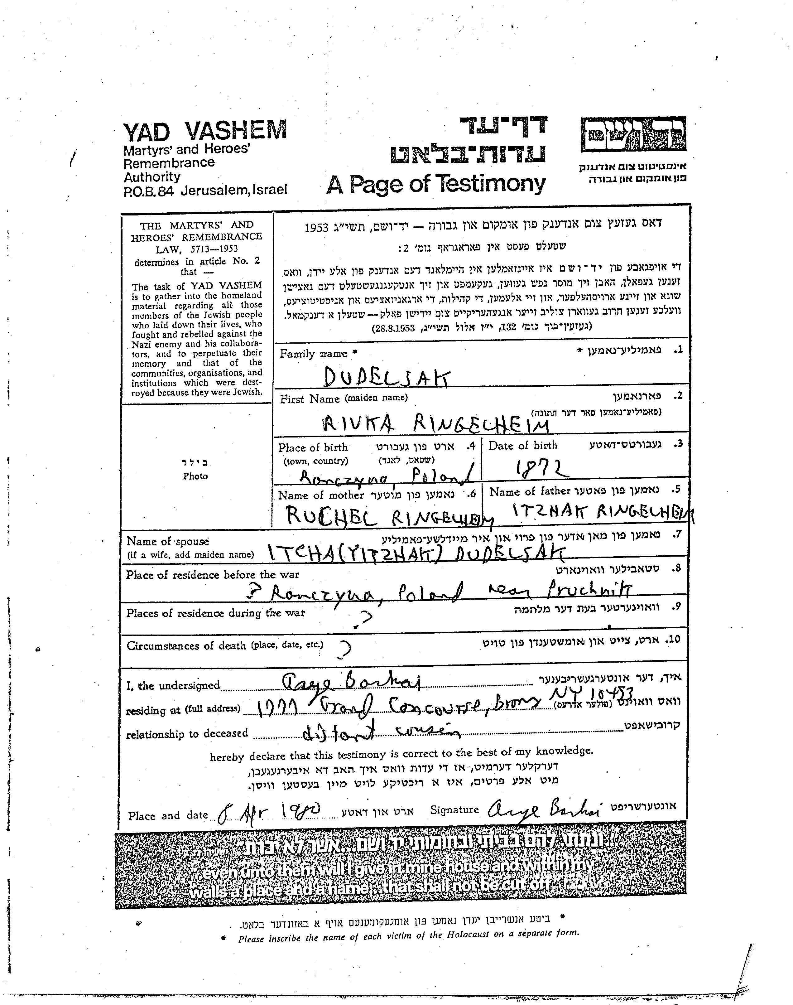 Rivka Dudelsak, geb. Ringelheim wurde im Jahr 1872 in Ronczyna, Polen geboren. Sie war die Tochter von Itzhak und Ruchel. Sie war mit Itcha Verheiratet. Vor dem Zweiten Weltkrieg lebte sie in Ronczyna, Polen.