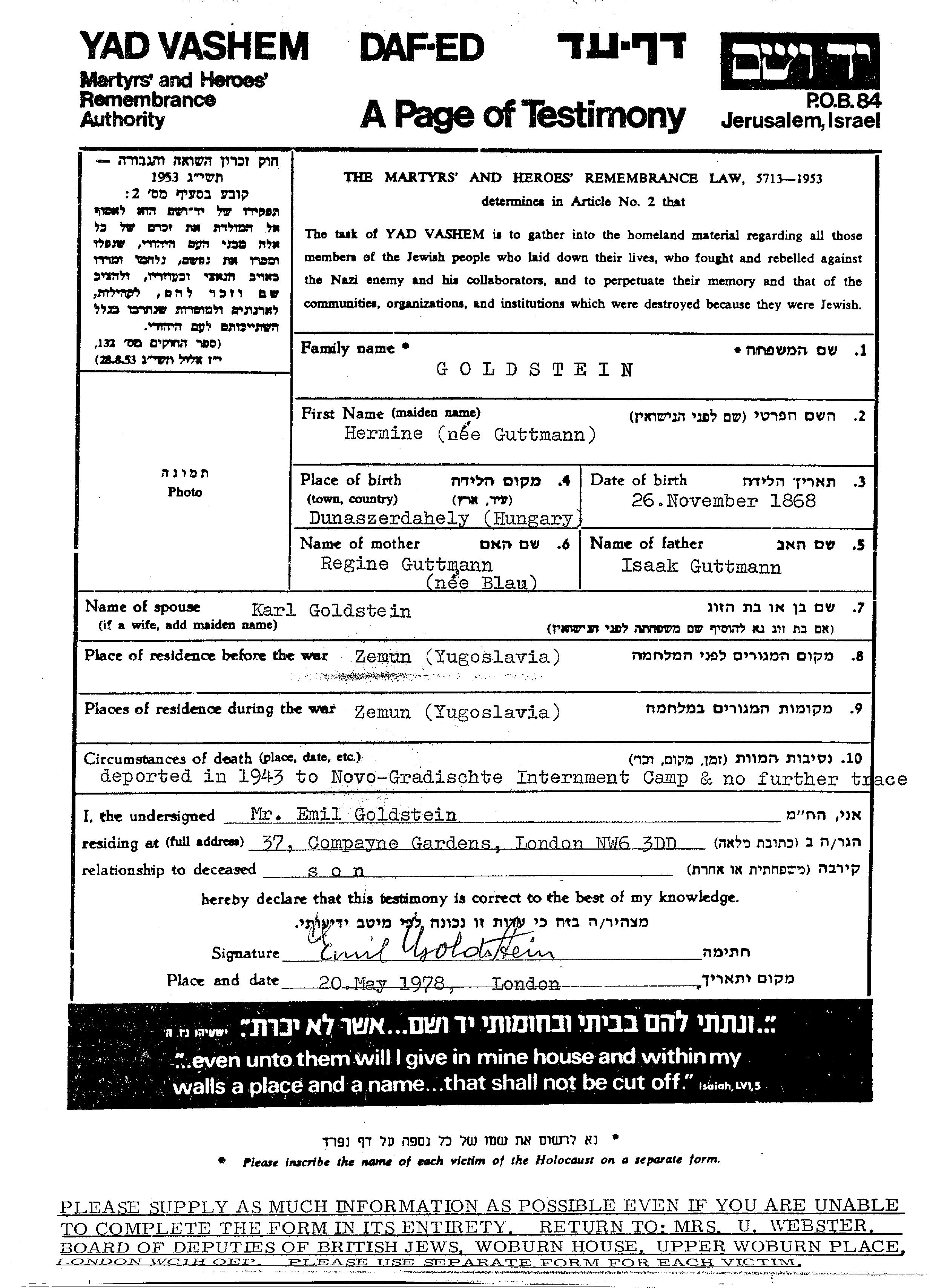 Hermine Goldstein, geb. Guttmann wurde im Jahr 1868 in Dunaszerdahely, Tschechoslowakei geboren. Sie war die Tochter von Isaak und Regine, geb. Blau. Vor dem Zweiten Weltkrieg lebte sie in Zemun, Jugoslawien. Während des Krieges war sie in Zemun, Jugoslawien.