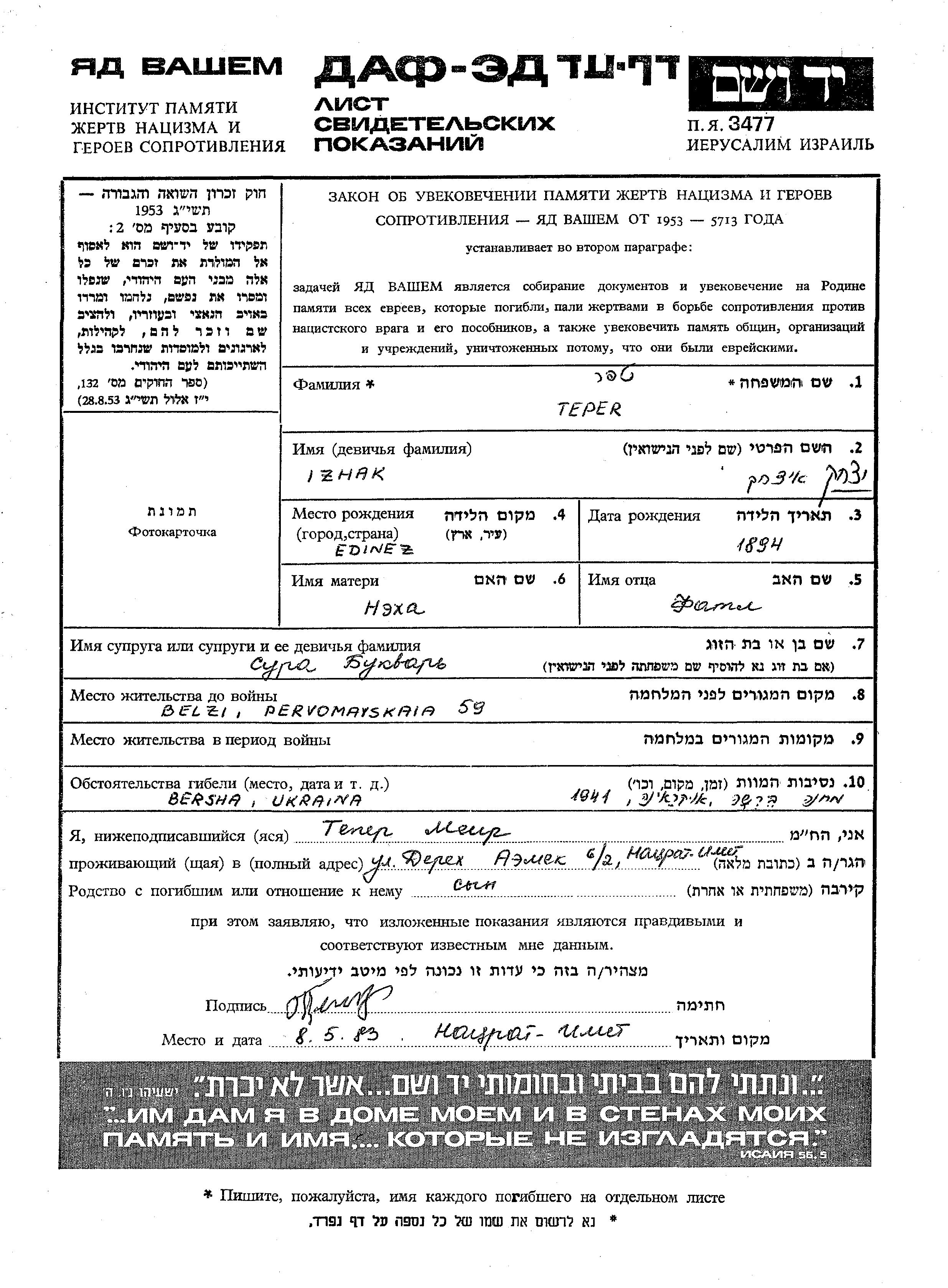 Izhak Teper wurde im Jahr 1894 in Yedinets, Rumänien geboren. Er war der Sohn von Fatl und Nekha. Er war mit Sura, geb. Bukvar Verheiratet. Vor dem Zweiten Weltkrieg lebte er in Belc, Rumänien.