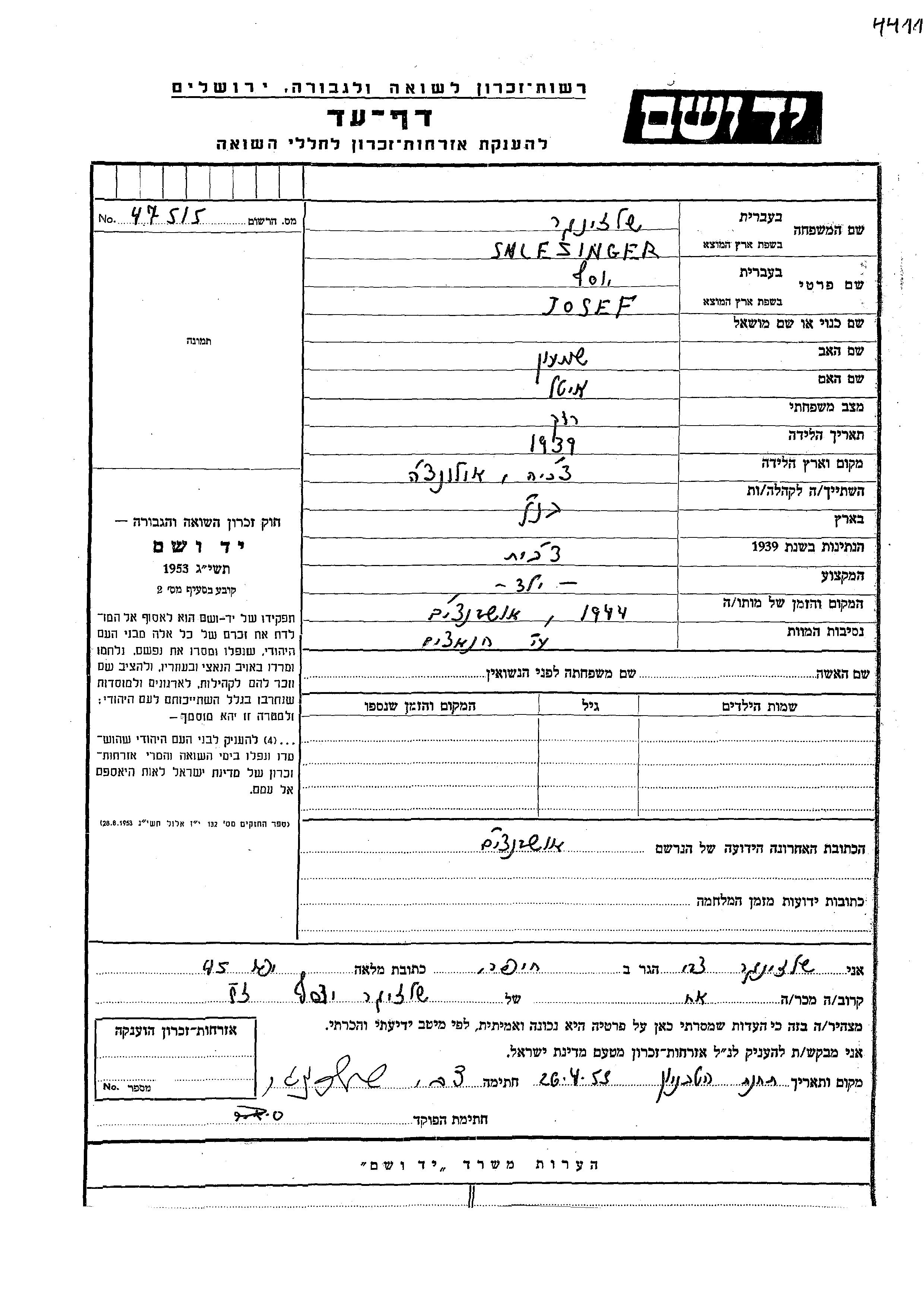 Josef Shlezinger wurde im Jahr 1939 in Ilonca, Tschechoslowakei geboren. Er war der Sohn von Shimon und Itel. Er war Kind. Vor dem Zweiten Weltkrieg lebte er in Ilonca, Tschechoslowakei. Während des Krieges war er in Auschwitz, Polen.