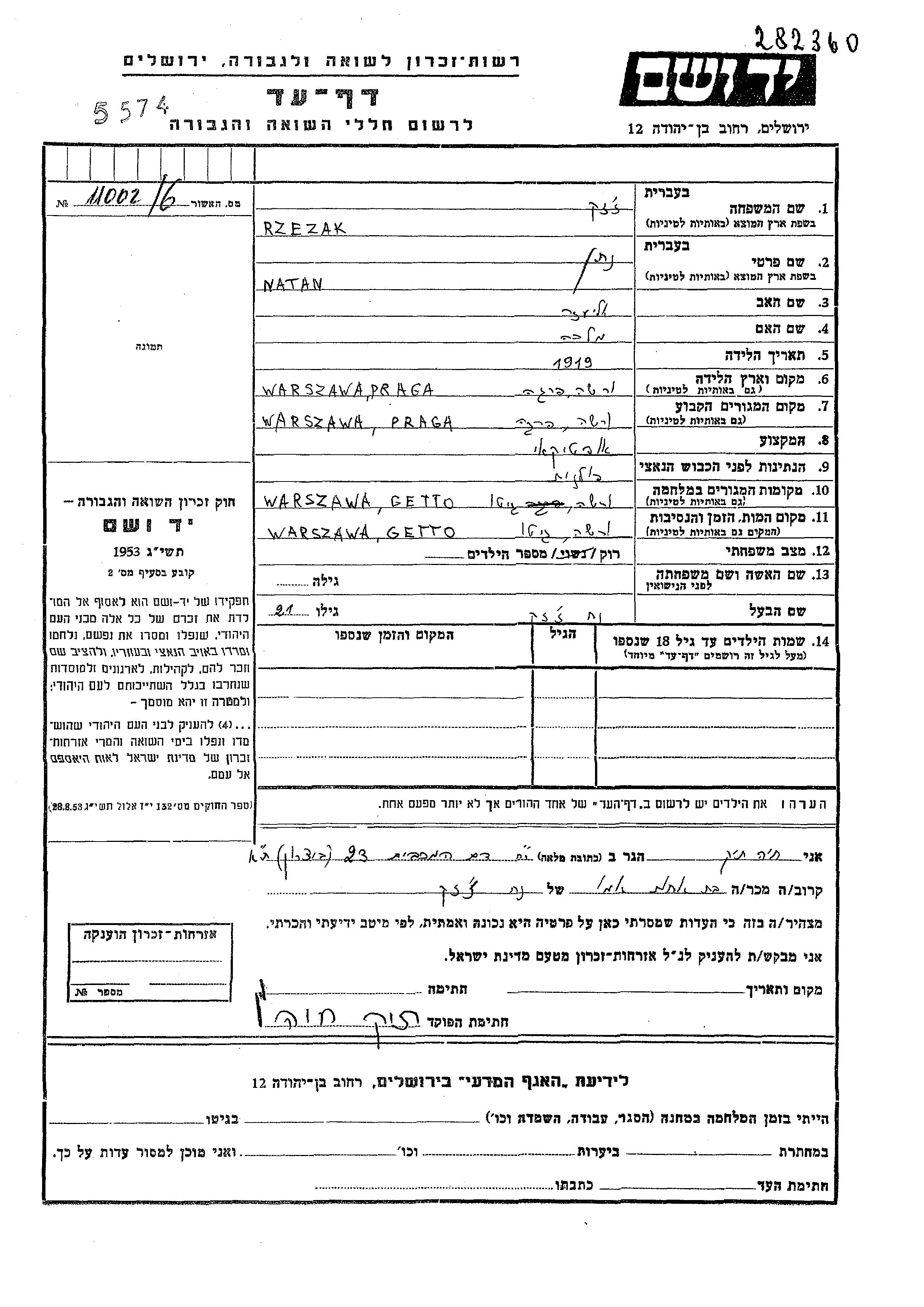 Natan Rzezak wurde im Jahr 1919 in Warsaw, Polen geboren. Er war der Sohn von Eliezer und Malka. Er war Optiker und Ledig. Vor dem Zweiten Weltkrieg lebte er in Warsaw, Polen. Während des Krieges war er in Warsaw, Polen.