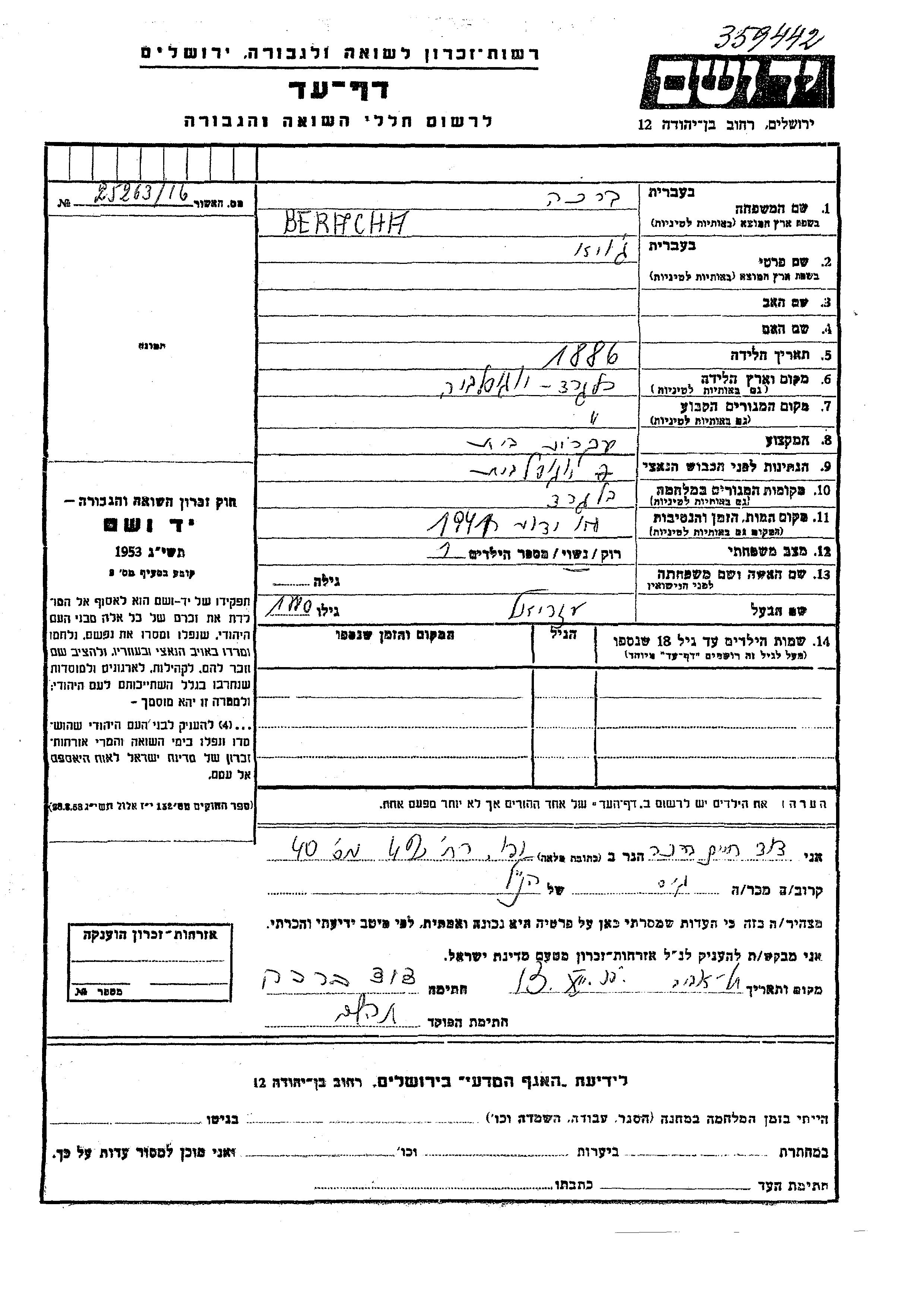 Dzhoia Beracha wurde im Jahr 1886 in Belgrade, Jugoslawien geboren. Sie war Hausfrau und mit Azriel Verheiratet. Vor dem Zweiten Weltkrieg lebte sie in Belgrade, Jugoslawien. Während des Krieges war sie in Belgrade, Jugoslawien.