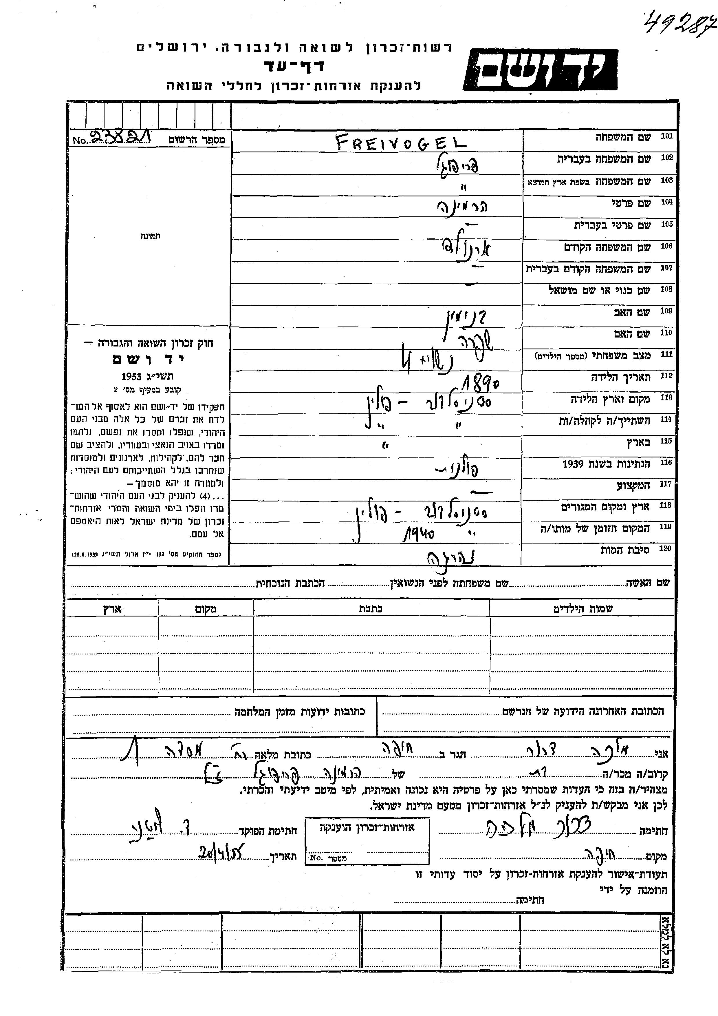 Hermina Freivogel, geb. Arnold wurde im Jahr 1890 in Stanislawow, Polen geboren. Sie war die Tochter von Beniamin und Shifra. Sie war Verheiratet. Vor dem Zweiten Weltkrieg lebte sie in Stanislawow, Polen.