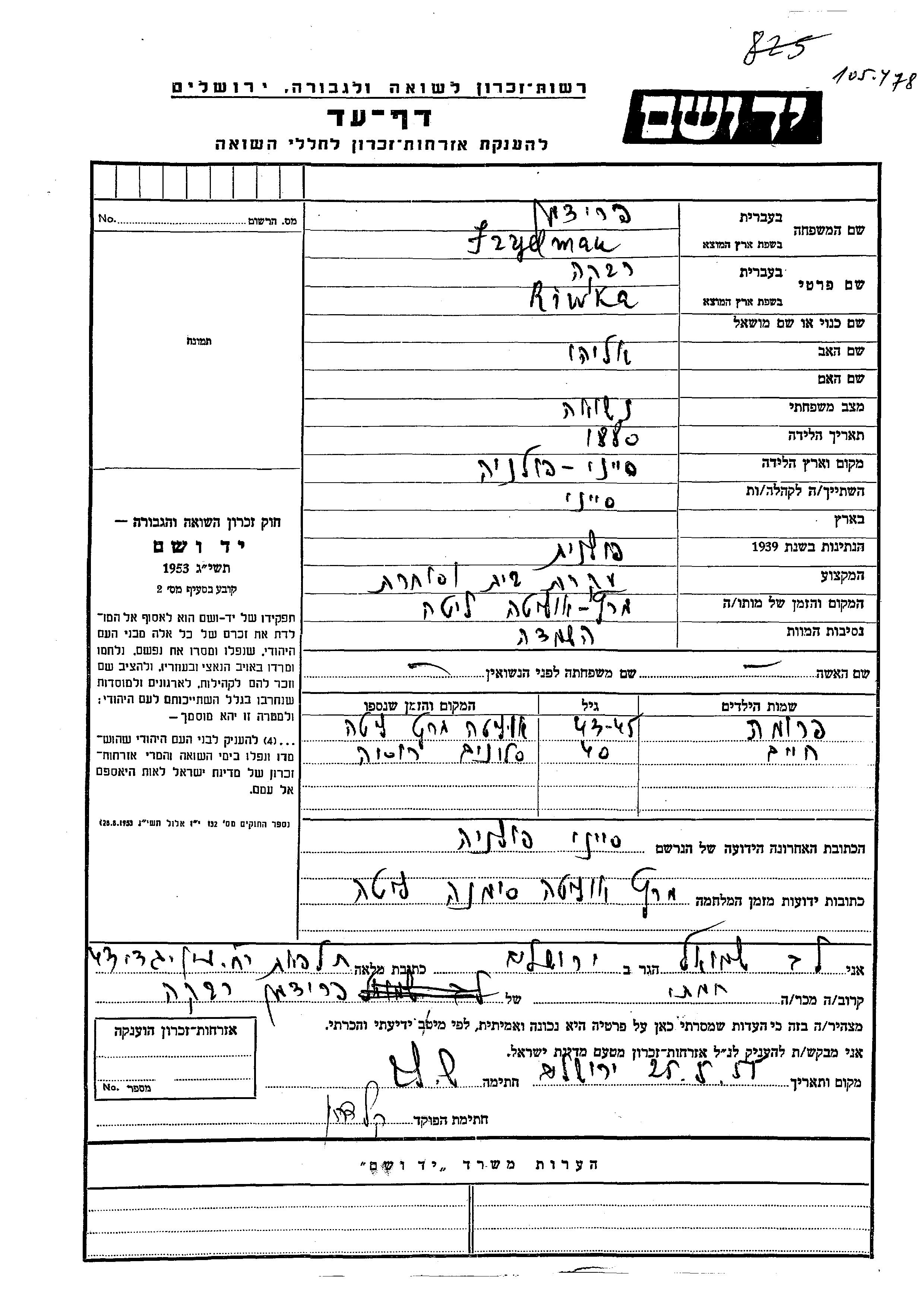 Riwka Frydman wurde im Jahr 1880 in Sejni, Polen geboren. Sie war die Tochter von Eliahu. Sie war Kaufmann/-frau und Verheiratet. Vor dem Zweiten Weltkrieg lebte sie in Sejni, Polen. Während des Krieges war sie in Sejni, Polen.