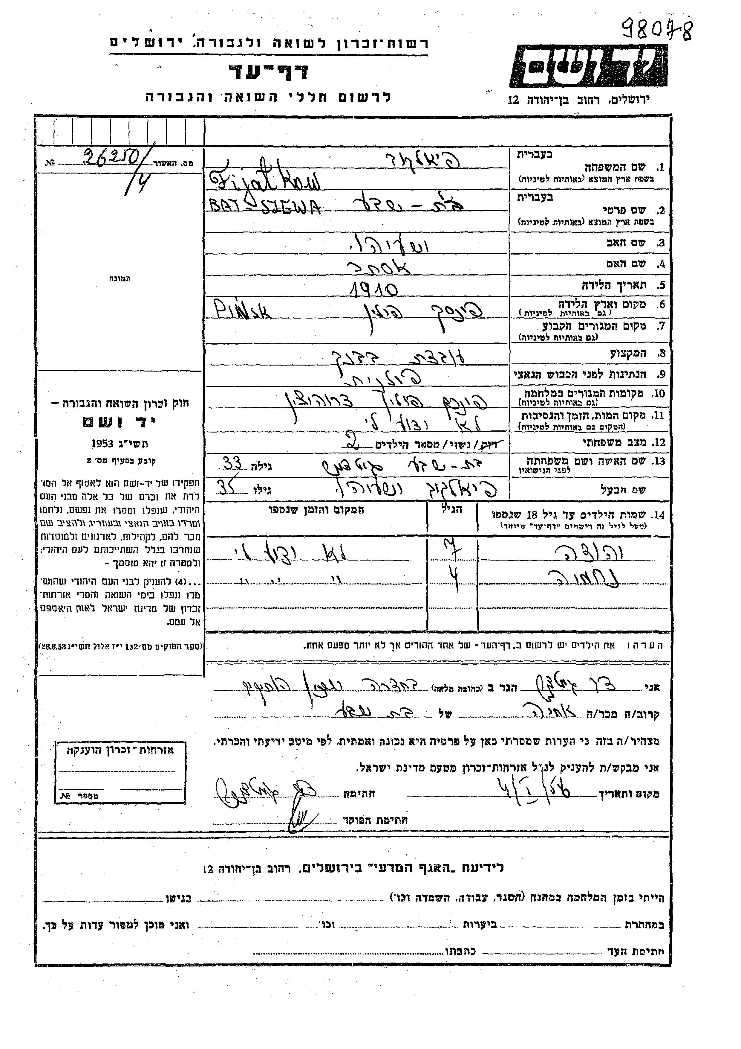 Bat Szewa Fijalkow, geb. Gotdiner wurde im Jahr 1910 in Pinsk, Polen geboren. Sie war die Tochter von Yeshayahu und Ester. Sie war Bankangestellte/-r und mit Yeshayahu Verheiratet. Während des Krieges war sie in Pinsk, Polen.