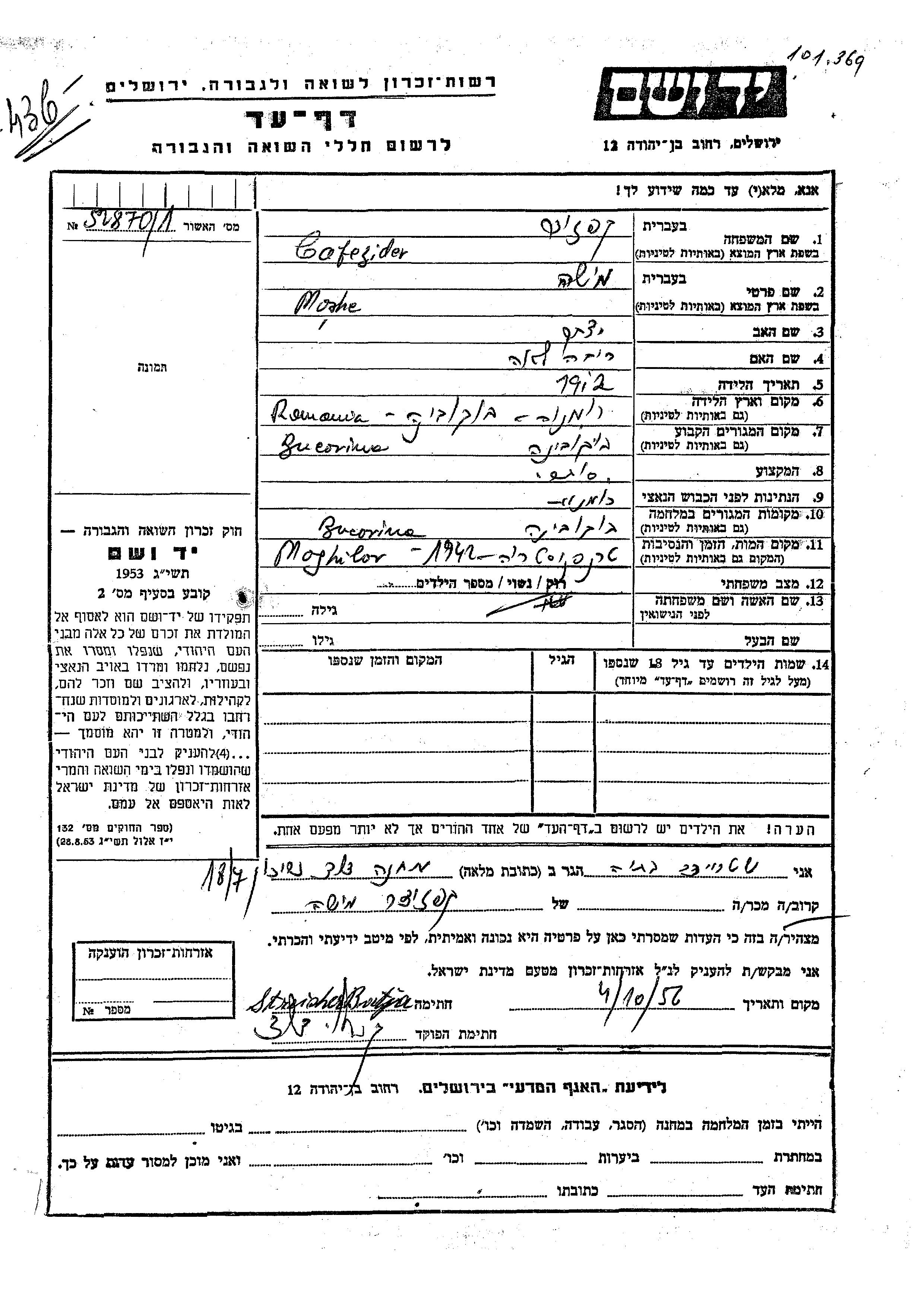 Misha Moshe Cafezider wurde im Jahr 1912 in Bukovina, Rumänien geboren. Er war der Sohn von Yitzkhak und Riva Lea. Er war Kaufmann/-frau und Verheiratet. Vor dem Zweiten Weltkrieg lebte er in Bukovina, Rumänien. Während des Krieges war er in Bukovina, Rumänien.