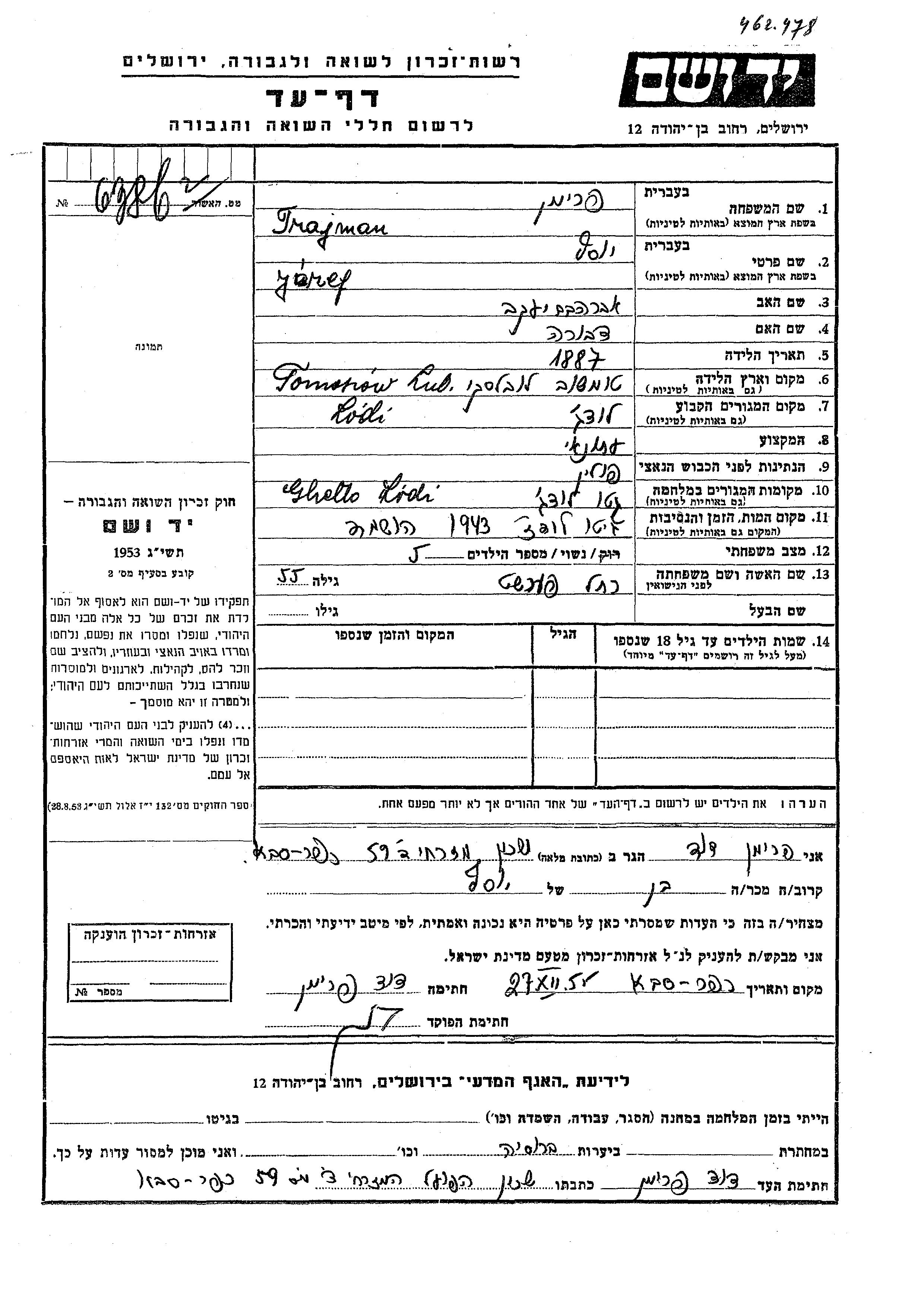 Jozef Frajman Friman wurde im Jahr 1887 in Tomaszow, Polen geboren. Er war der Sohn von Avraham Yaakov und Dvora. Er war Journalist/-in und mit Rakhel, geb. Fersht Verheiratet. Vor dem Zweiten Weltkrieg lebte er in Lodz, Polen. Während des Krieges war er in Lodz, Polen.