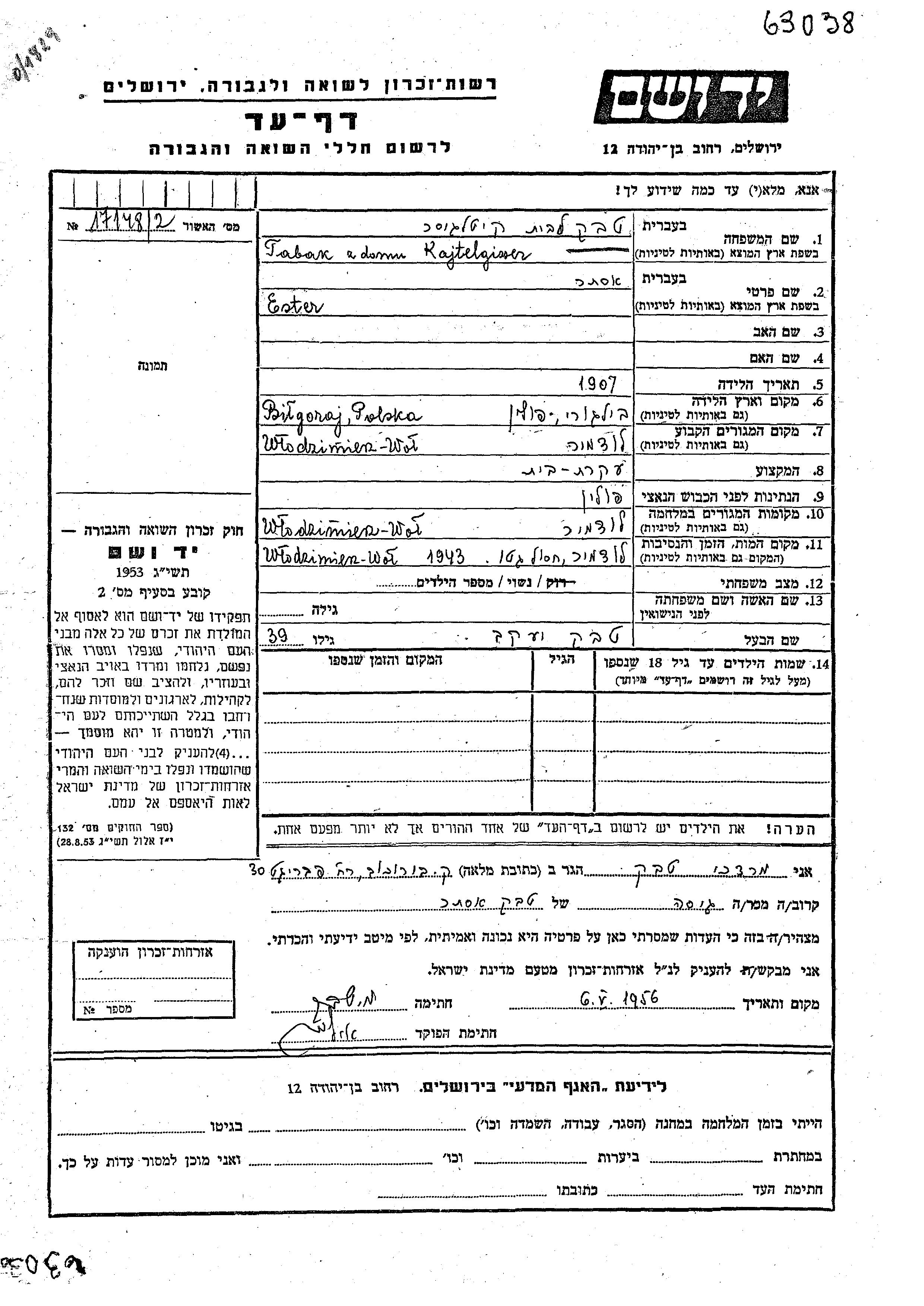 Ester Tabak, geb. Kajtelgisser wurde im Jahr 1907 geboren. Sie war Hausfrau und mit Yaakov Verheiratet. Vor dem Zweiten Weltkrieg lebte sie in Wlodzimierz Wolynski, Polen. Während des Krieges war sie in Wlodzimierz Wolynski, Polen.