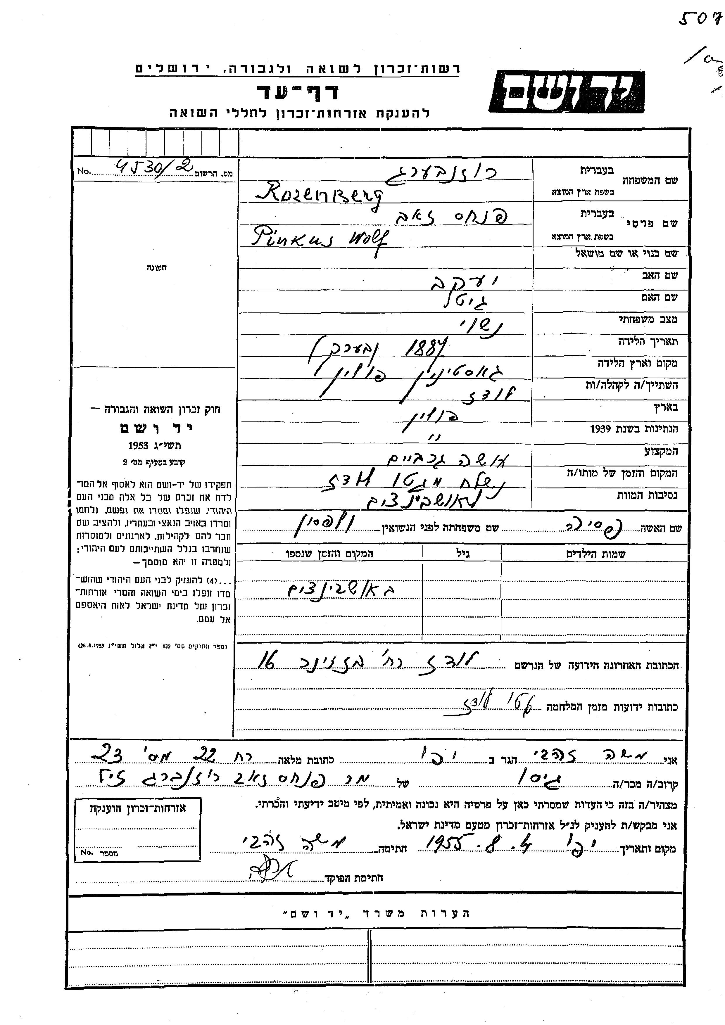 Pinkhas Wolf Zeev Rozenberg wurde im Jahr 1887 in Gostynin, Polen geboren. Er war der Sohn von Yaakov und Gitel. Er war Strumpffabrikant. Vor dem Zweiten Weltkrieg lebte er in Lodz, Polen. Während des Krieges war er in Lodz, Polen.
