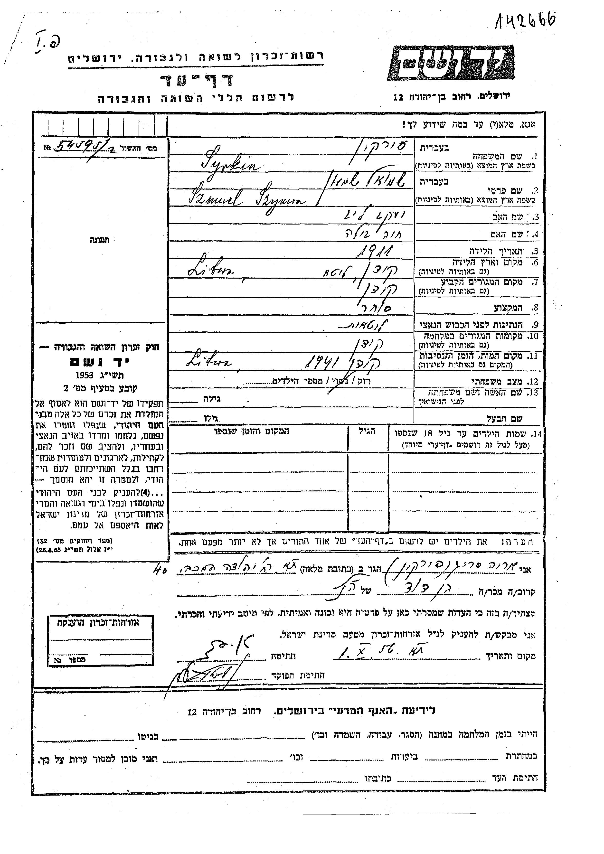 Syrkin Szmuel Szymon 1911 Kedainiai, Litauen Gedenkblatt