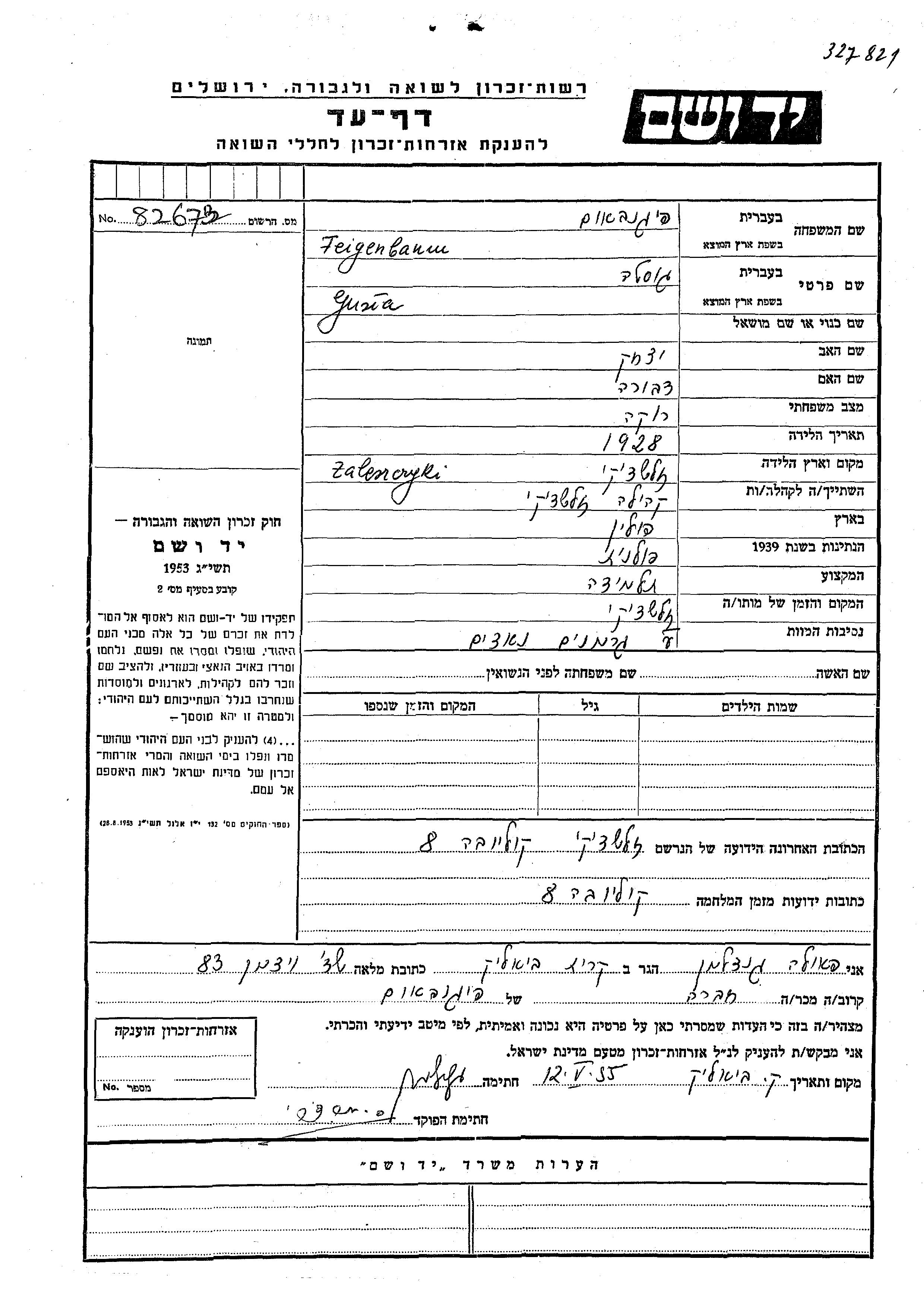 Gusta Feigenbaum wurde im Jahr 1928 in Zaleszczyki, Polen geboren. Sie war die Tochter von Yitzkhak und Dvora. Sie war Schüler/-in und Ledig. Vor dem Zweiten Weltkrieg lebte sie in Zaleszczyki, Polen. Während des Krieges war sie in Zaleszczyki, Polen.