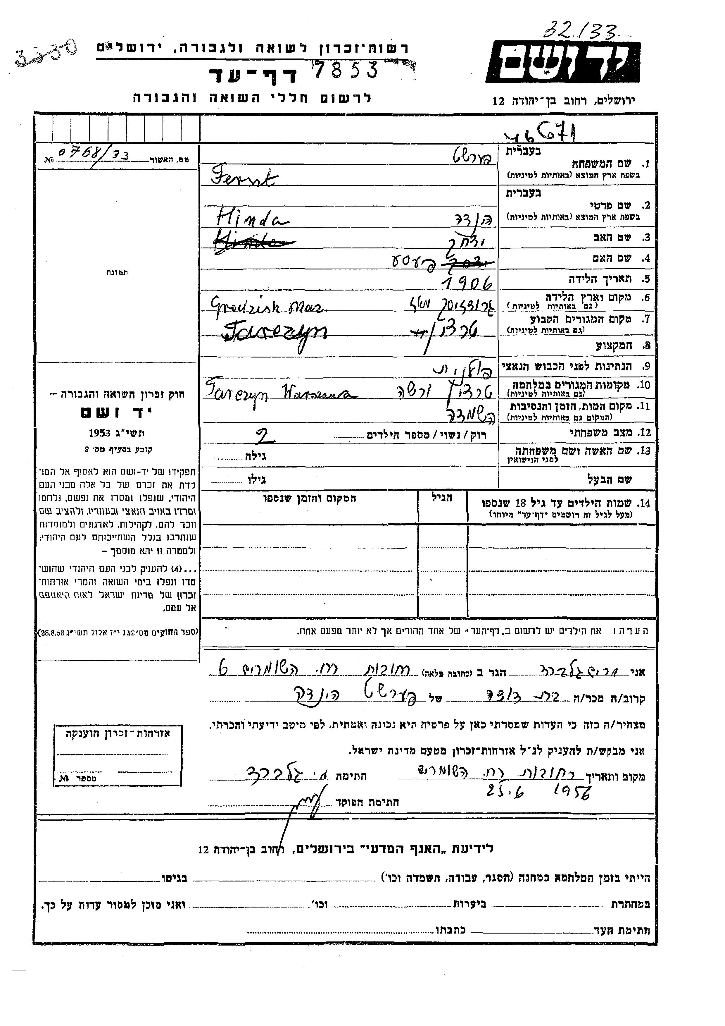 Hinda Ferszt wurde im Jahr 1906 in Grodzisk, Polen geboren. Sie war die Tochter von Yitzkhak und Pese. Sie war Verheiratet. Vor dem Zweiten Weltkrieg lebte sie in Tarczyn, Polen. Während des Krieges war sie in Tarczyn, Polen.