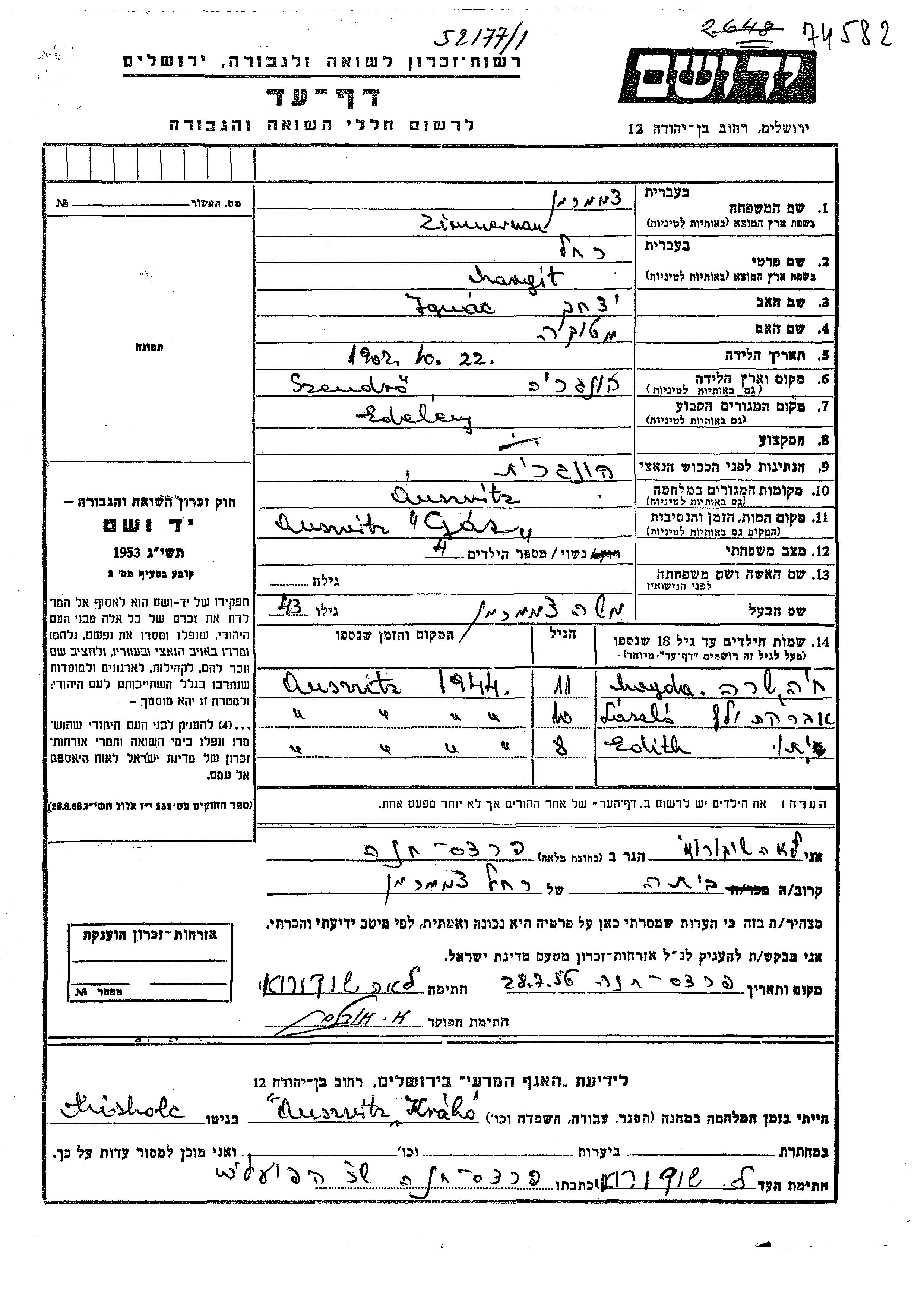 Zimmerman Margit Rakhel 1902 Edeleny, Ungarn Gedenkblatt