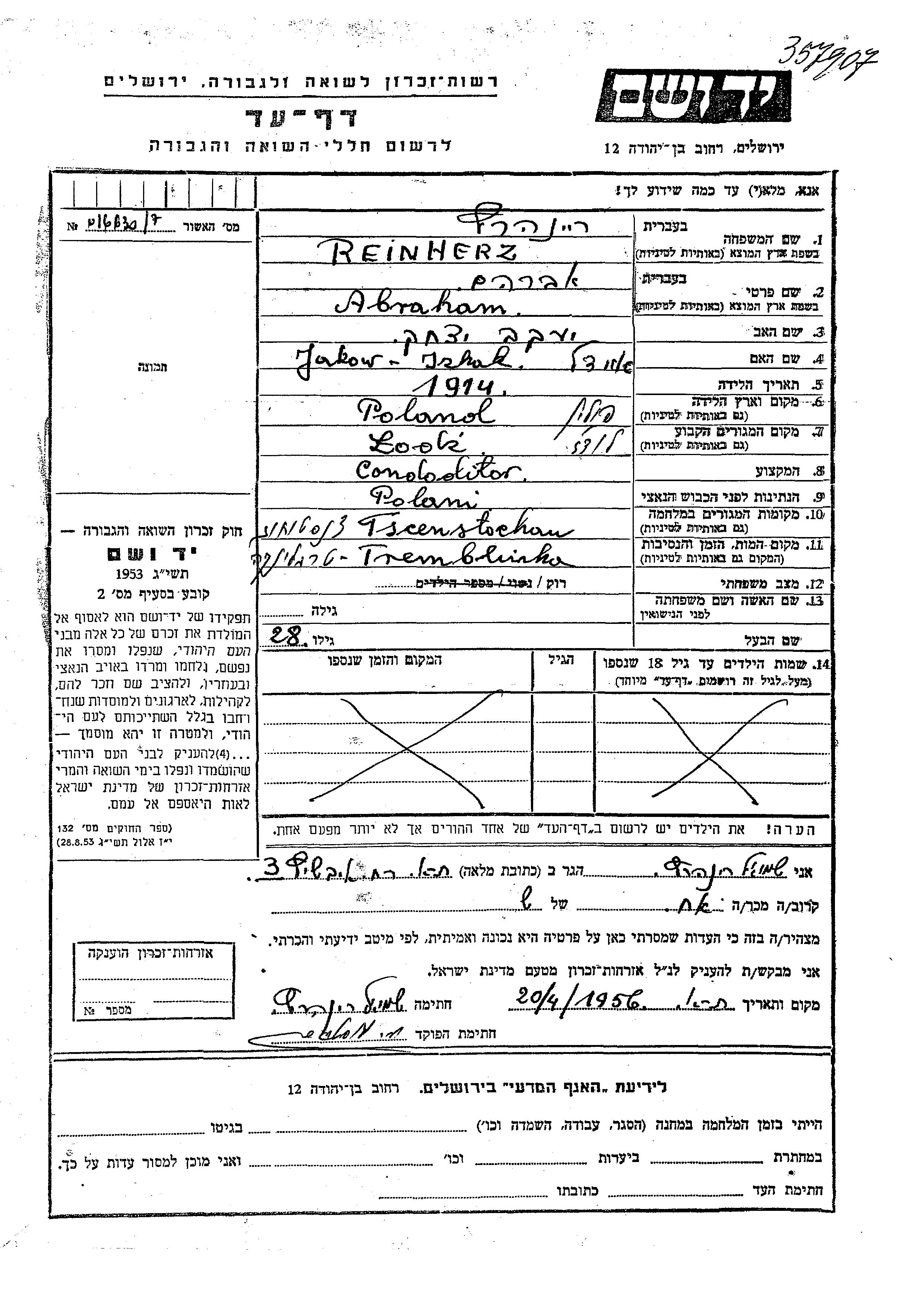 Abraham Reinherz wurde im Jahr 1914 in Polen geboren. Er war der Sohn von Jakow Izhak und Eidel. Er war Conditor und Ledig. Vor dem Zweiten Weltkrieg lebte er in Lodz, Polen. Während des Krieges war er in Czestochow, Polen.