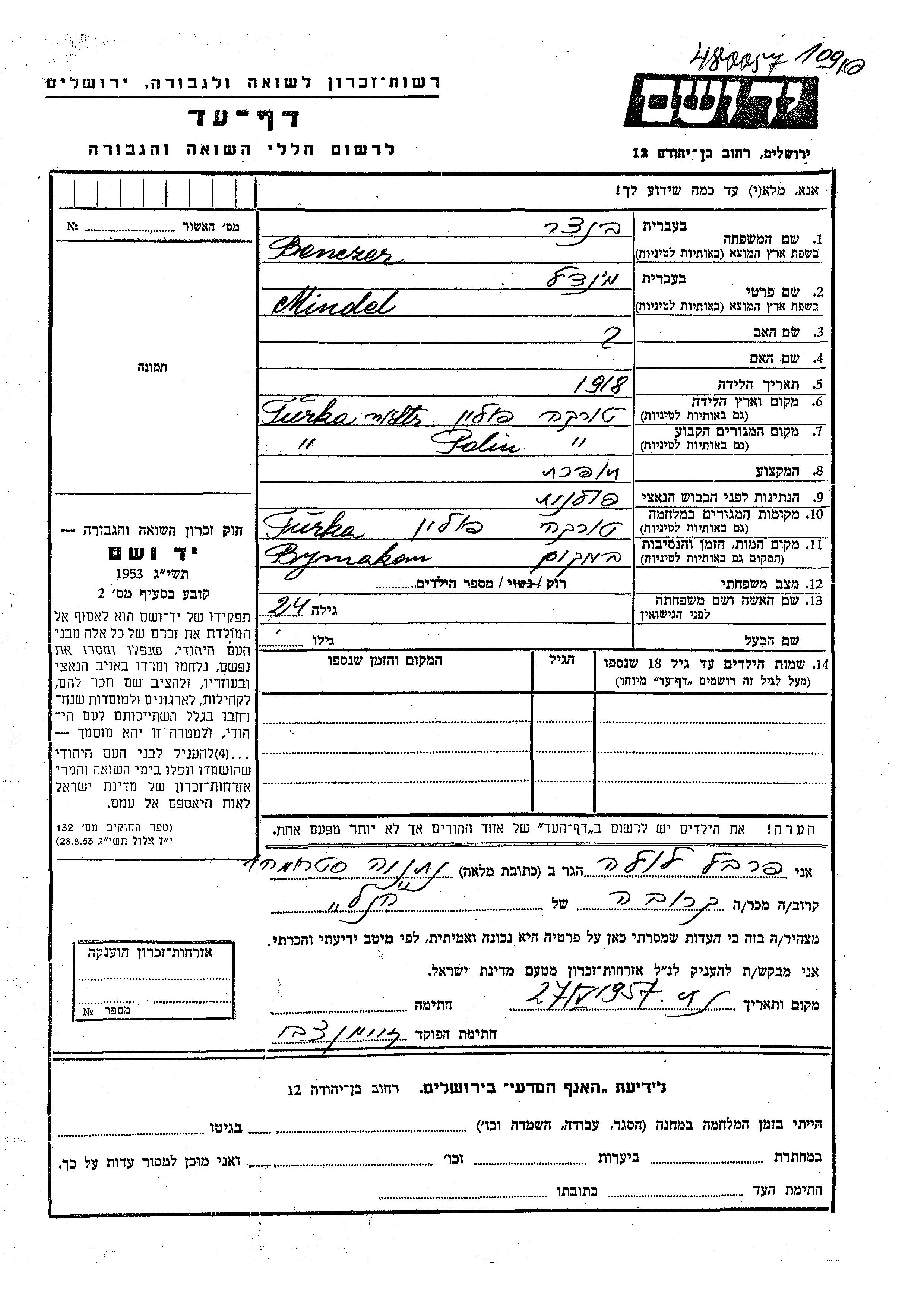 Mindl Benczer wurde im Jahr 1918 in Turka nad Stryjem, Polen geboren. Sie war Schneiderin und Verheiratet. Vor dem Zweiten Weltkrieg lebte sie in Turka nad Stryjem, Polen. Während des Krieges war sie in Turka nad Stryjem, Polen.
