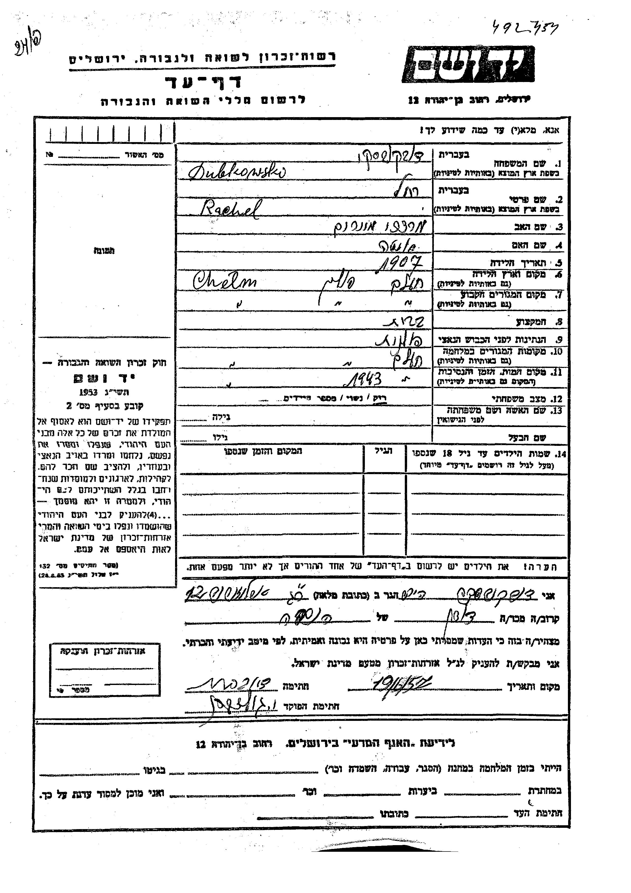 Rachel Dubkowski wurde im Jahr 1907 in Chelm, Polen geboren. Sie war die Tochter von Mordekhai Mairim und Ita. Sie war Hausfrau und Ledig. Vor dem Zweiten Weltkrieg lebte sie in Chelm, Polen. Während des Krieges war sie in Chelm, Polen.