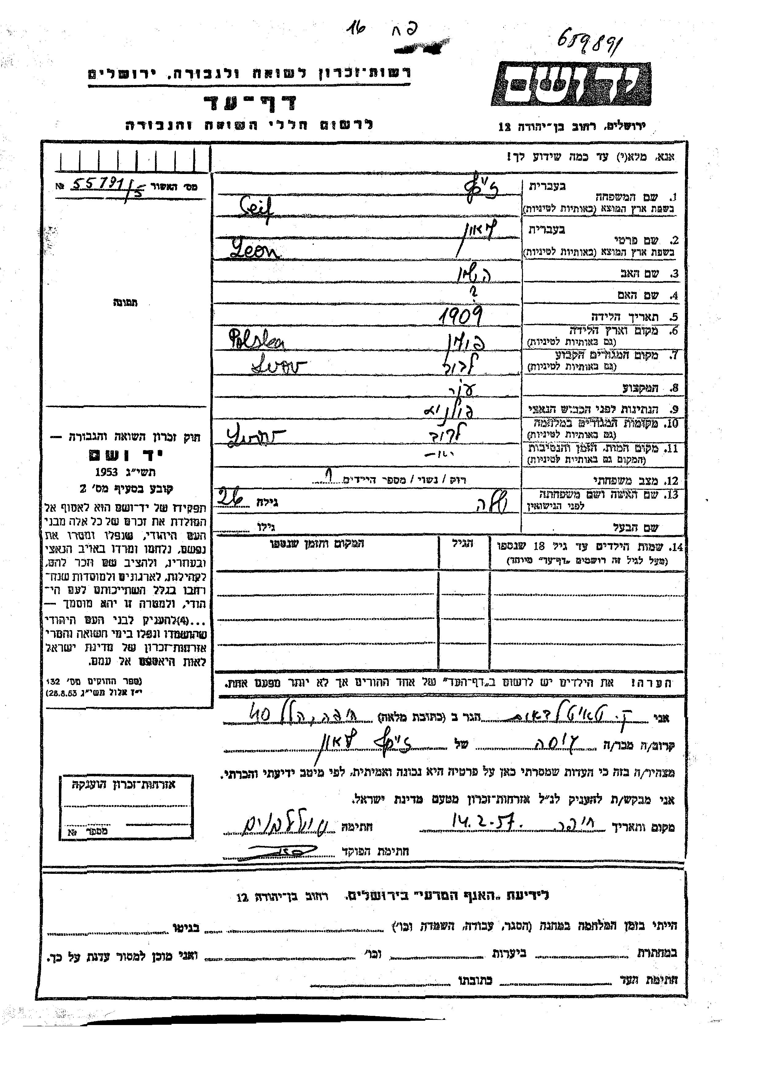 Lion Seif wurde im Jahr 1909 in Polen geboren. Er war der Sohn von Heshio. Er war Redakteur und mit Shela Verheiratet. Vor dem Zweiten Weltkrieg lebte er in Lvov, Polen. Während des Krieges war er in Lvov, Polen.