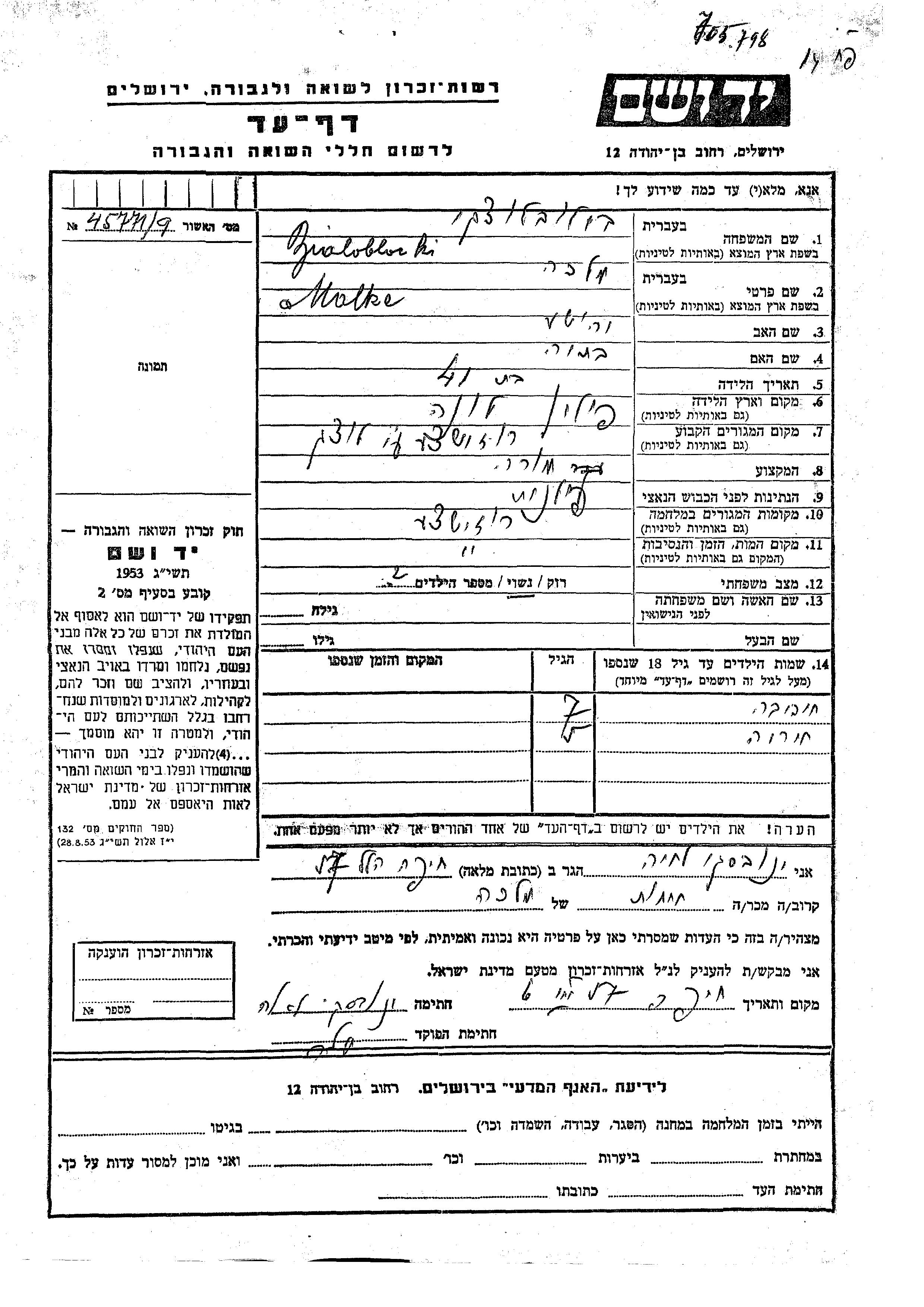 Malke Białobłocki wurde in Luna, Polen geboren. Sie war die Tochter von Yehoshua und Batia. Sie war Lehrer/in und Verheiratet. Vor dem Zweiten Weltkrieg lebte sie in Rozishtchov, Polen. Während des Krieges war sie in Rozishtchov, Polen.