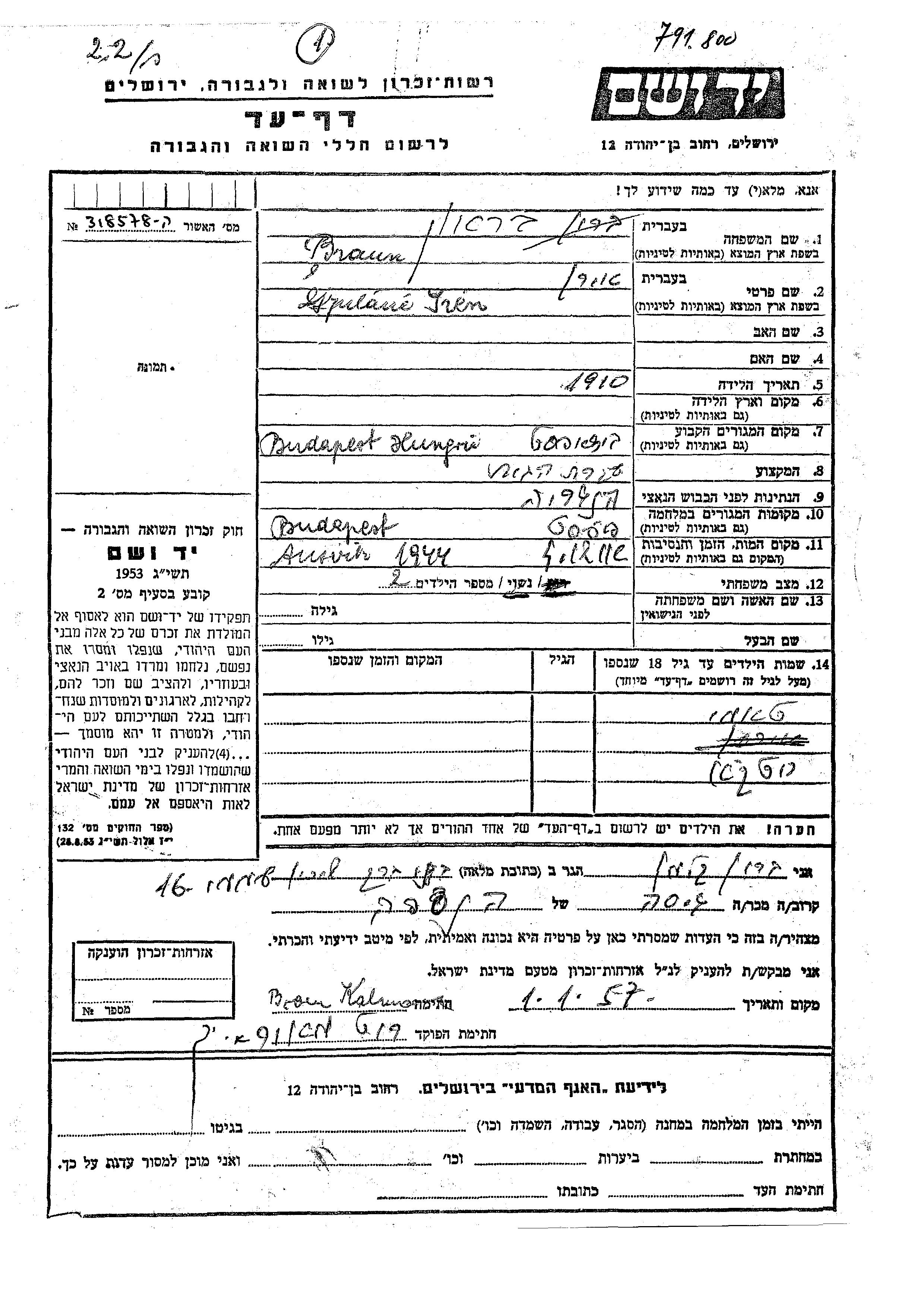 Iren Braun wurde im Jahr 1910 geboren. Sie war Hausfrau und mit Gyula Verheiratet. Vor dem Zweiten Weltkrieg lebte sie in Budapest, Ungarn. Während des Krieges war sie in Budapest, Ungarn.