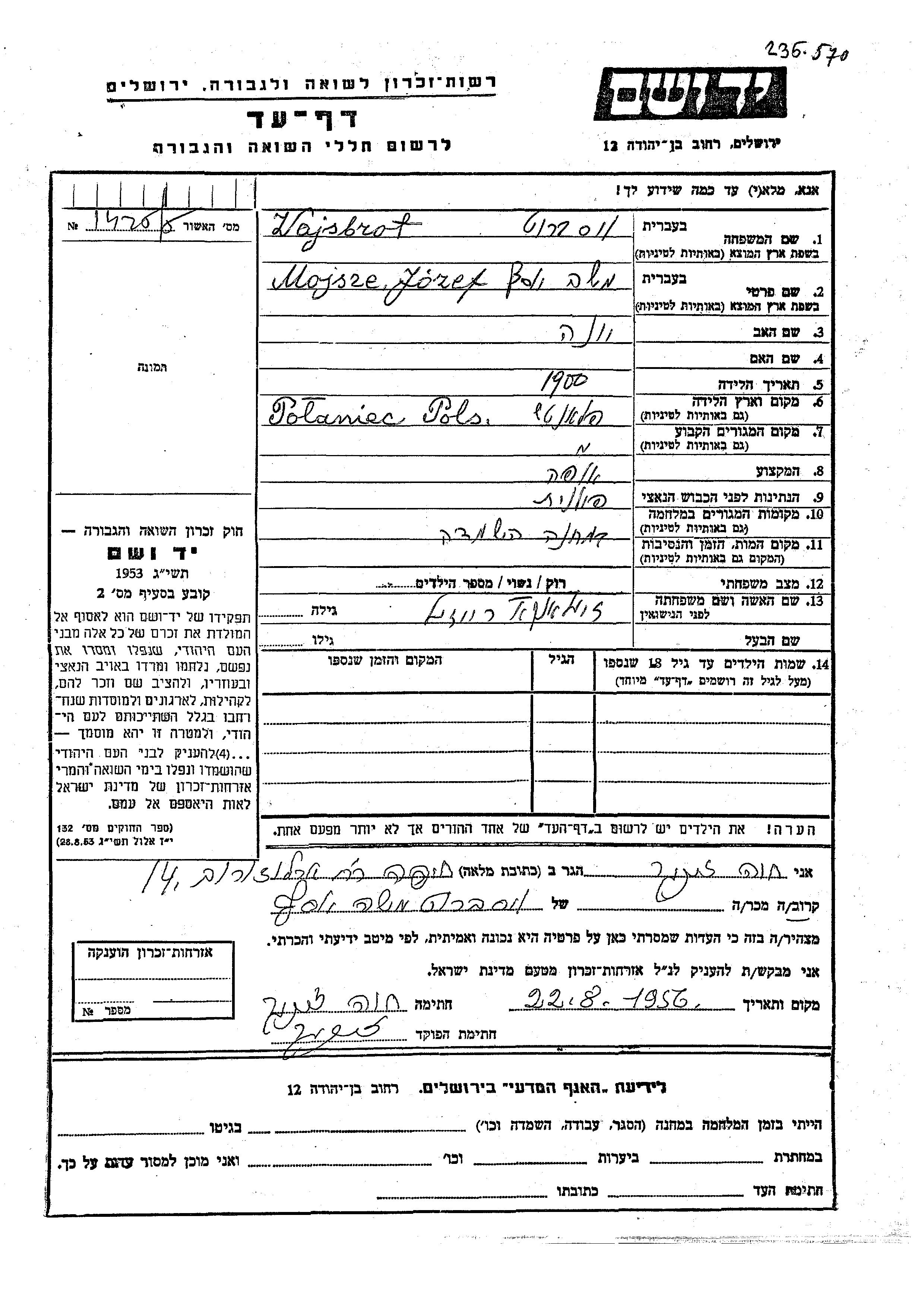 Mojsze Jozef Wajsbrot wurde im Jahr 1900 in Polaniec, Polen geboren. Er war der Sohn von Yona. Er war Bäcker/-in und mit Reizil, geb. Zhelonka Verheiratet. Vor dem Zweiten Weltkrieg lebte er in Polaniec, Polen.