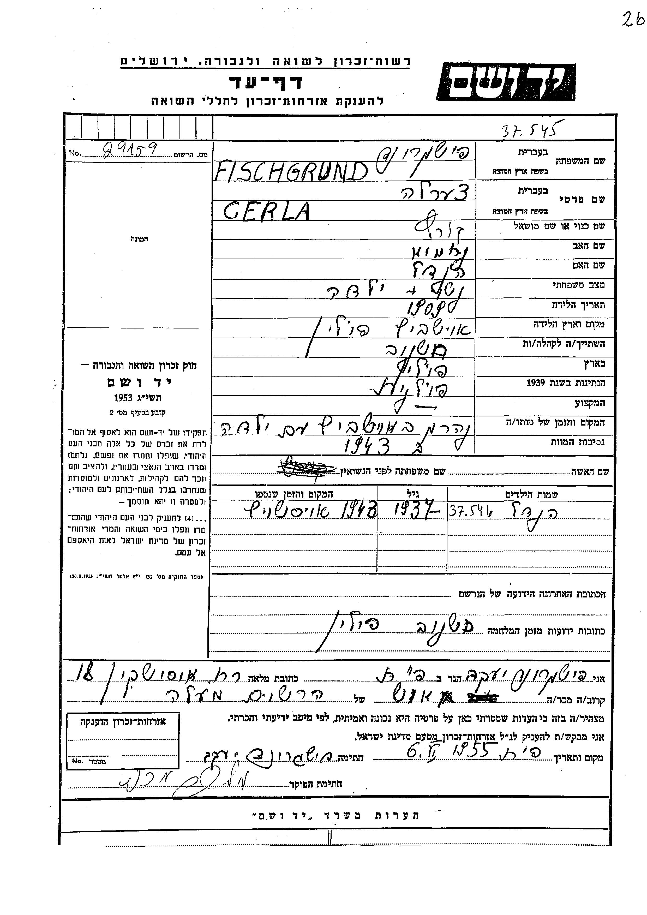 Cerla Kurt Fischgrund wurde im Jahr 1909 in Auschwitz, Polen geboren. Sie war die Tochter von Nekhemia und Hendel. Sie war Verheiratet. Vor dem Zweiten Weltkrieg lebte sie in Chrzanow, Polen. Während des Krieges war sie in Chrzanow, Polen.