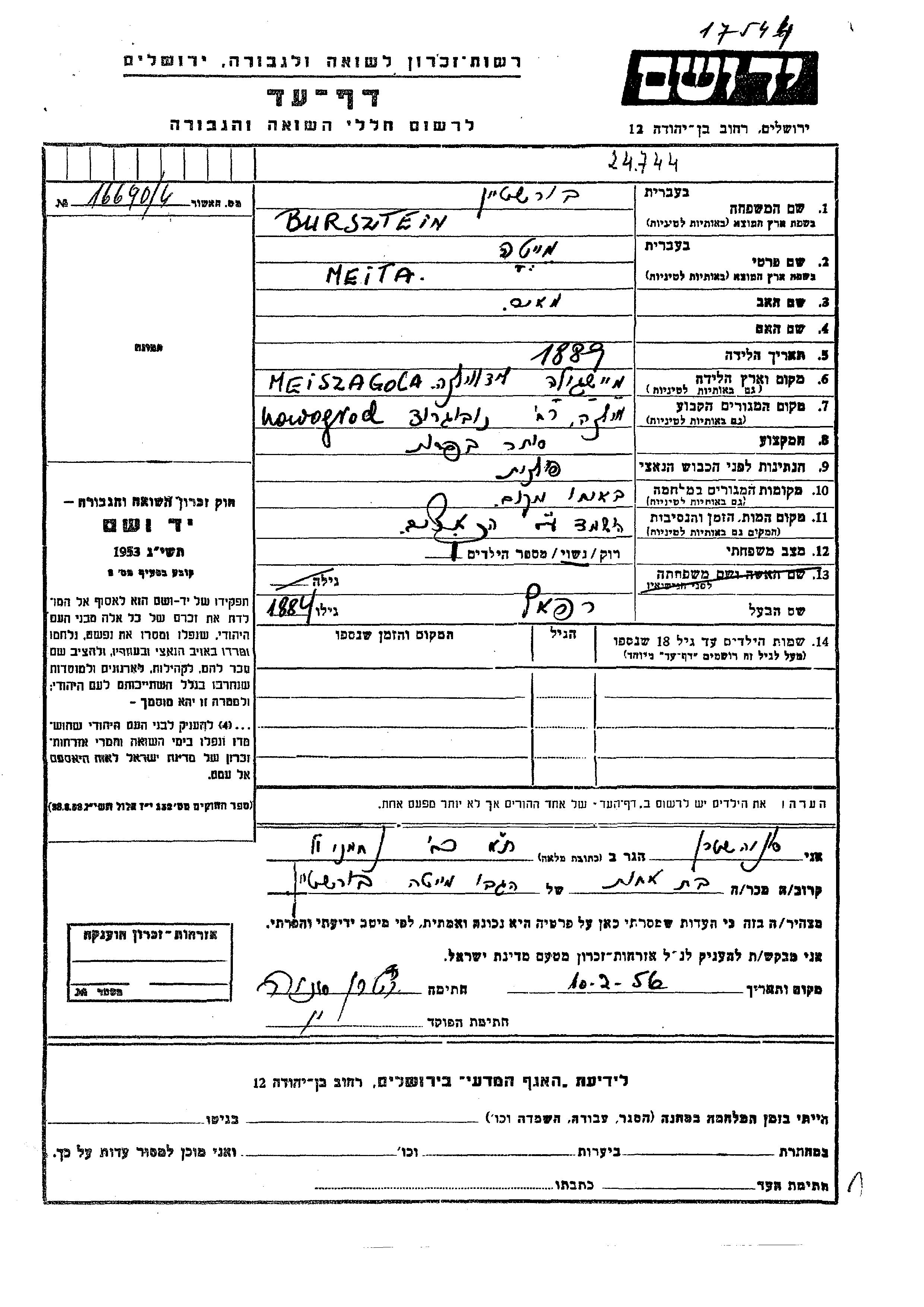 Meita Bursztein wurde im Jahr 1889 in Maishagola, Polen geboren. Sie war die Tochter von Meir. Sie war Viehhändler und mit Rafael Verheiratet. Vor dem Zweiten Weltkrieg lebte sie in Wilno, Polen. Während des Krieges war sie in Wilno, Polen.