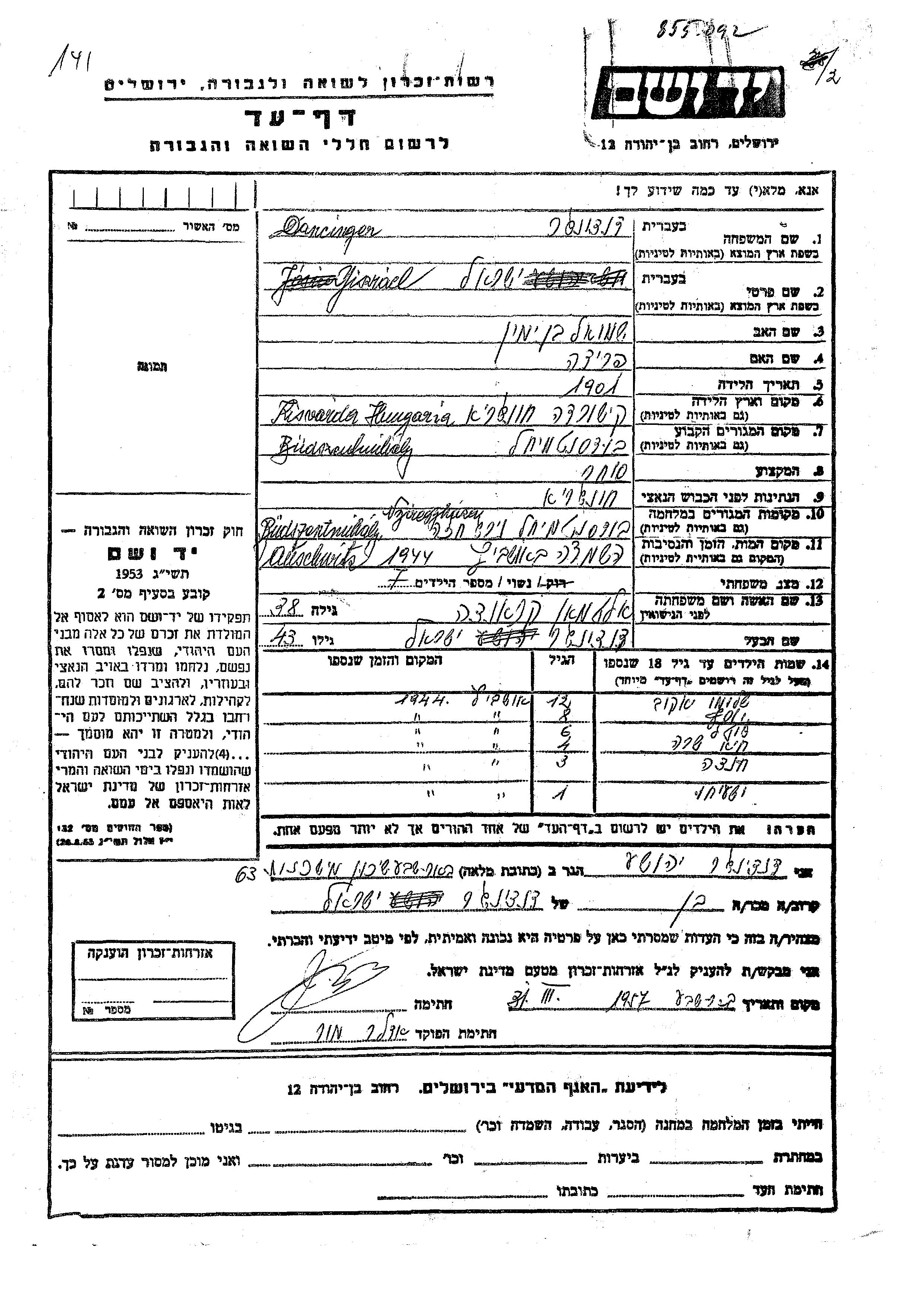 Yisrael Dancinger wurde im Jahr 1901 in Kisvarda, Ungarn geboren. Er war der Sohn von Shmuel Beniamin und Frida. Er war Kaufmann/-frau und mit Kreina, geb. Altman Verheiratet. Vor dem Zweiten Weltkrieg lebte er in Budszentmihaly, Ungarn. Während des Krieges war er in Budszentmihaly, Ungarn.