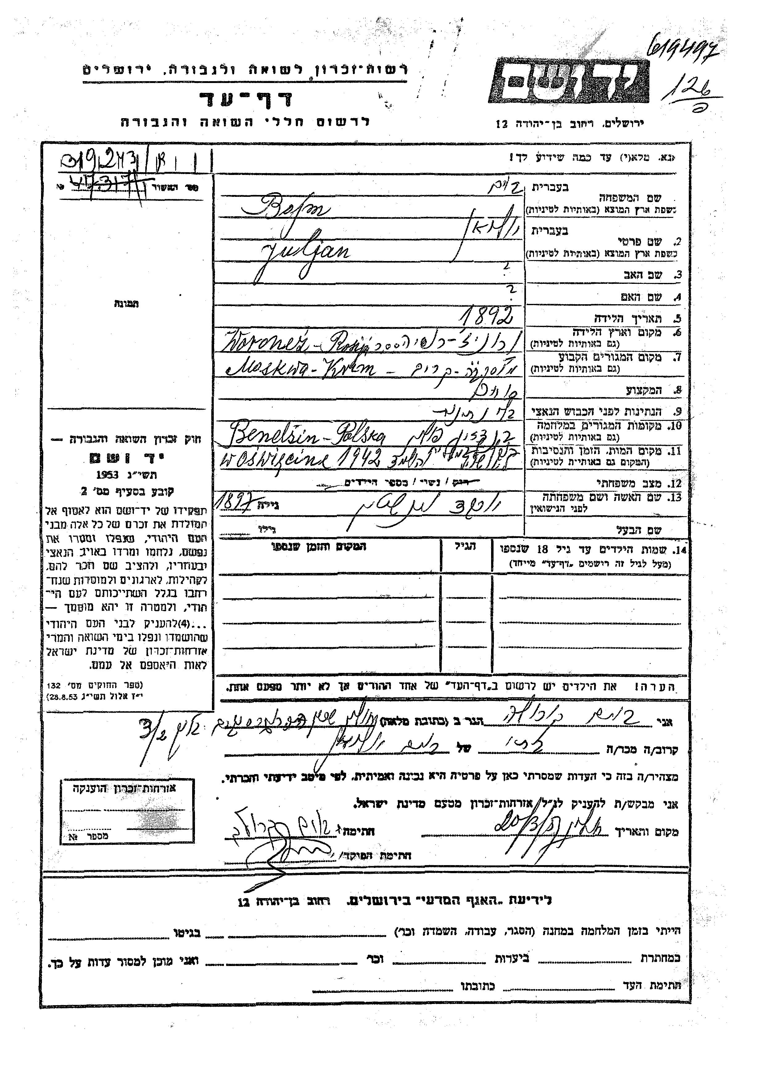 Juljan Bojm wurde im Jahr 1892 in Voronezh, Russland (UdSSR) geboren. Er war Kaufmann/-frau und mit Yokheved, geb. Veinshtein Verheiratet. Vor dem Zweiten Weltkrieg lebte er in Moskva, Russland (UdSSR). Während des Krieges war er in Bendzin, Polen.