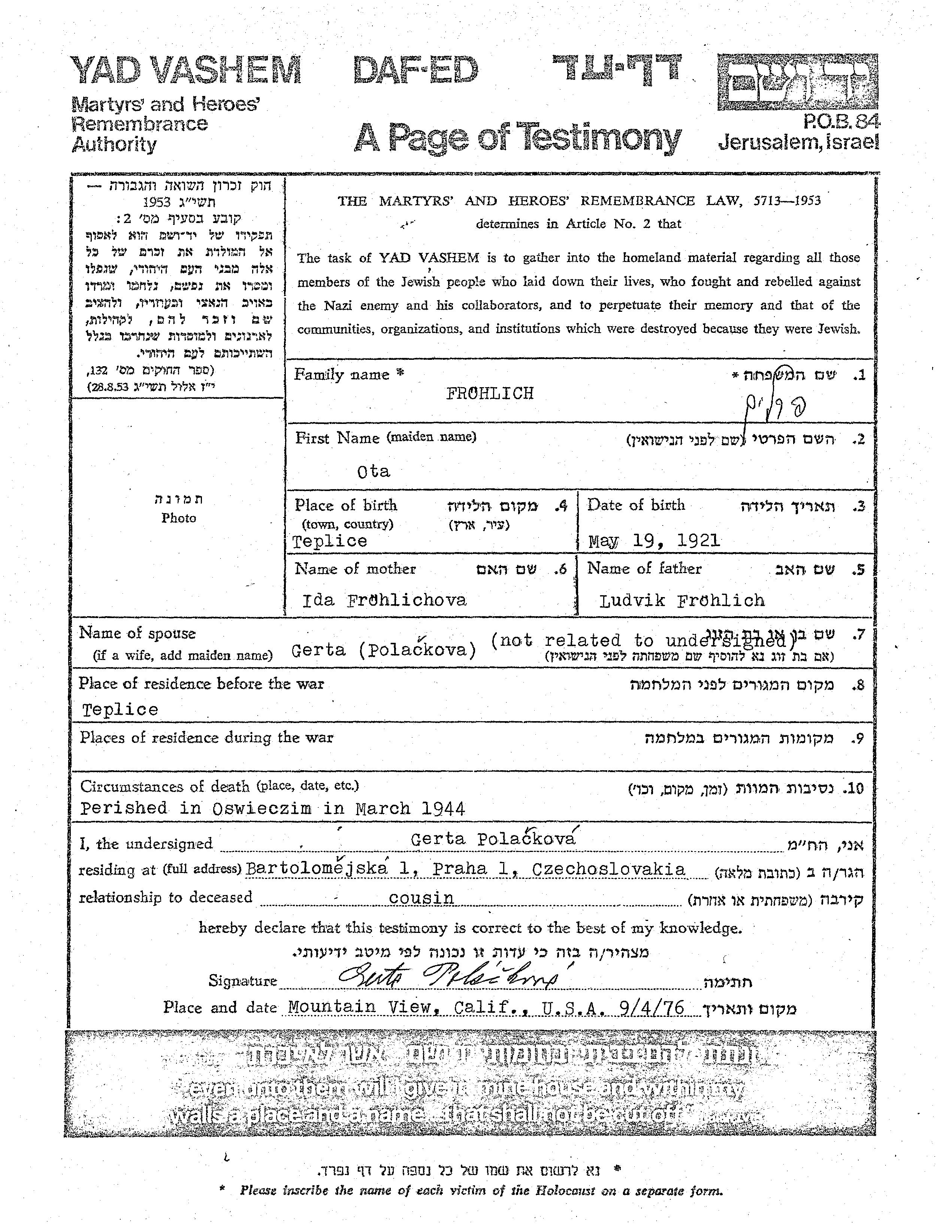 Ota Frohlich wurde im Jahr 1921 in Teplice, Tschechoslowakei geboren. Er war der Sohn von Ludvik und Ida. Er war mit Gerta, geb. Polackova Verheiratet. Vor dem Zweiten Weltkrieg lebte er in Teplice, Tschechoslowakei.