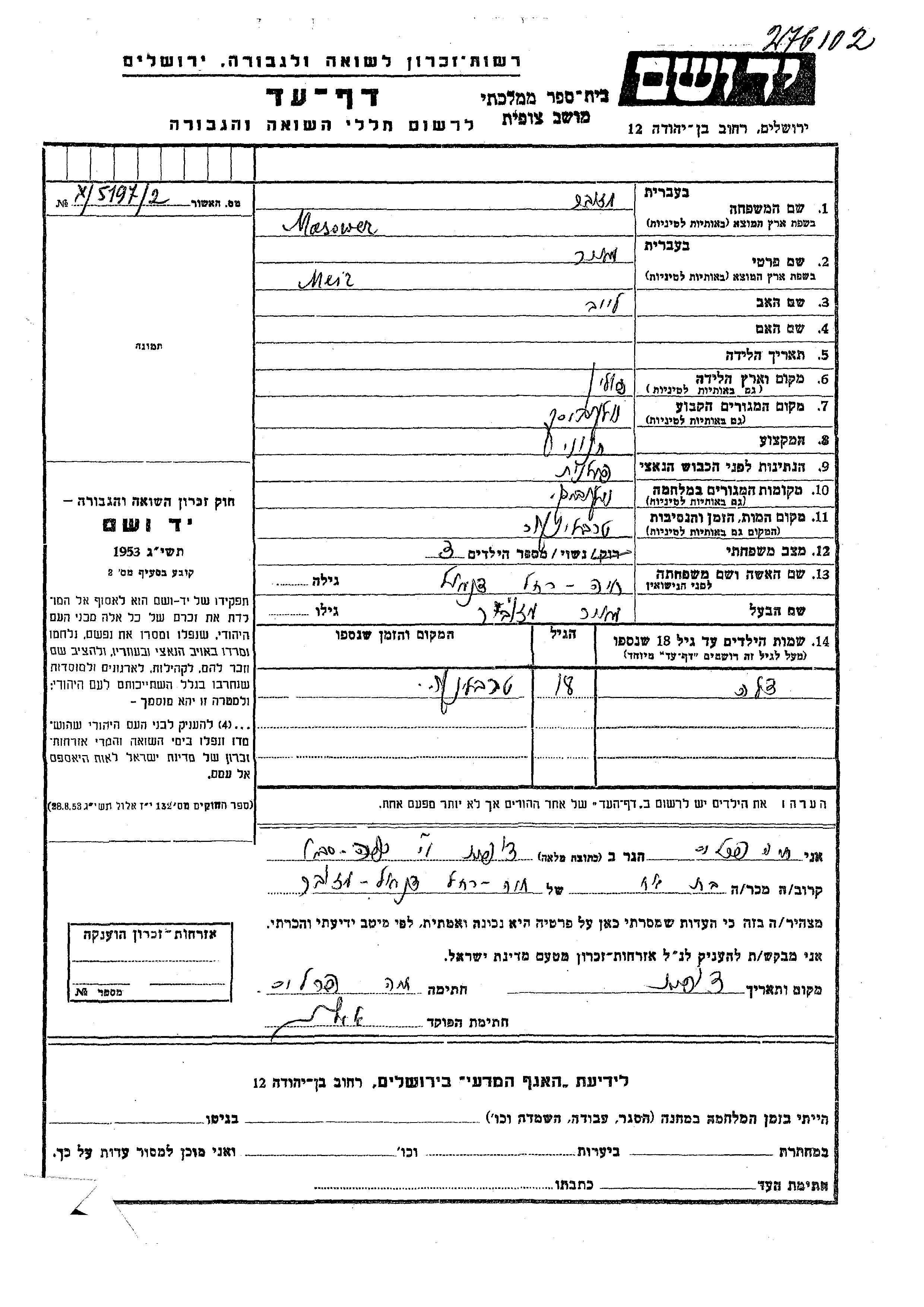 Meir Masower wurde in Polen geboren. Er war der Sohn von Leib. Er war Lebensmittelhändler/-in und mit Rakhel, geb. Daniel Verheiratet. Vor dem Zweiten Weltkrieg lebte er in Wolkowysk, Polen. Während des Krieges war er in Wolkowysk, Polen.