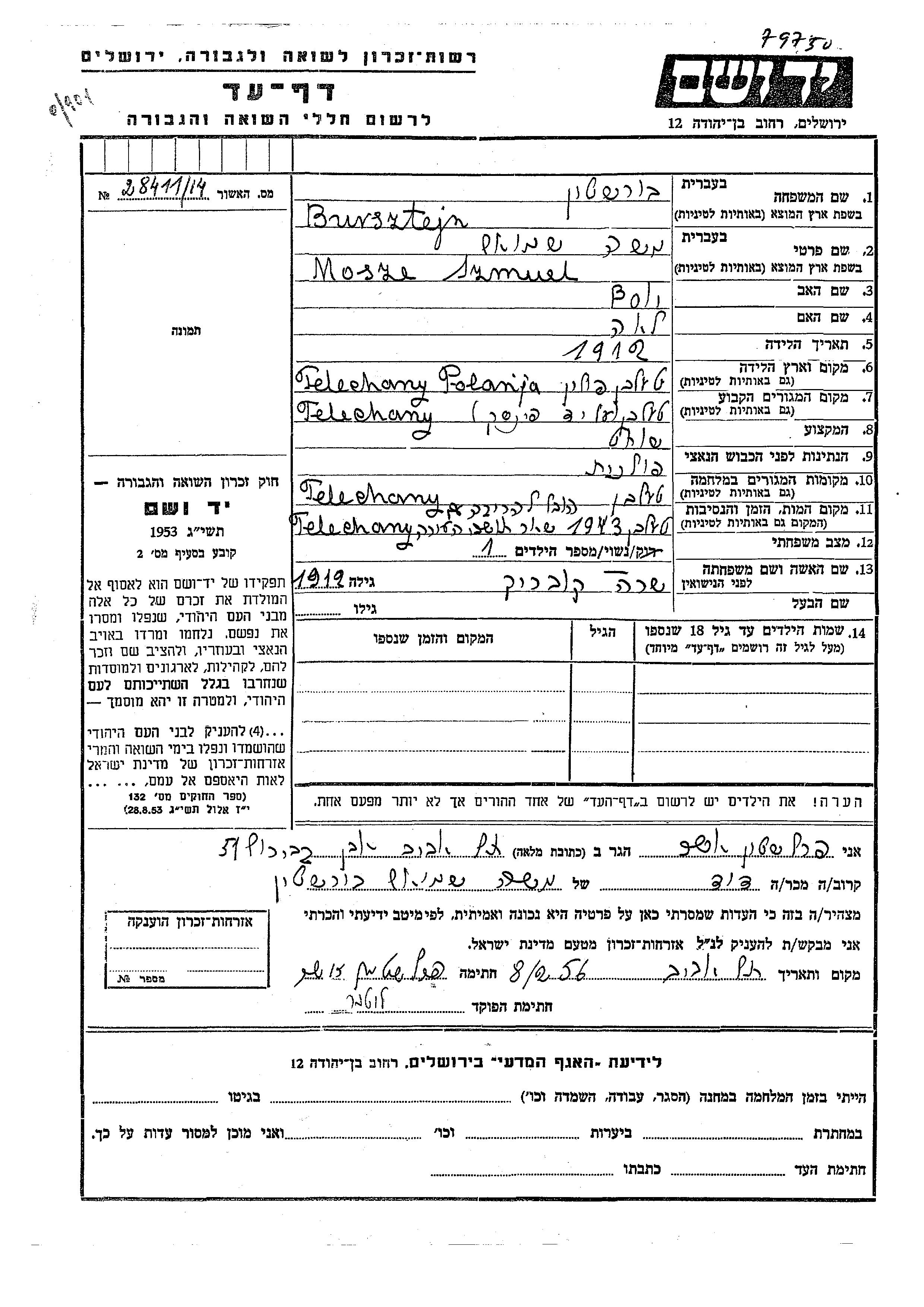 Bursztejn Mosze Szmuel 1912 Telechany, Polen Gedenkblatt