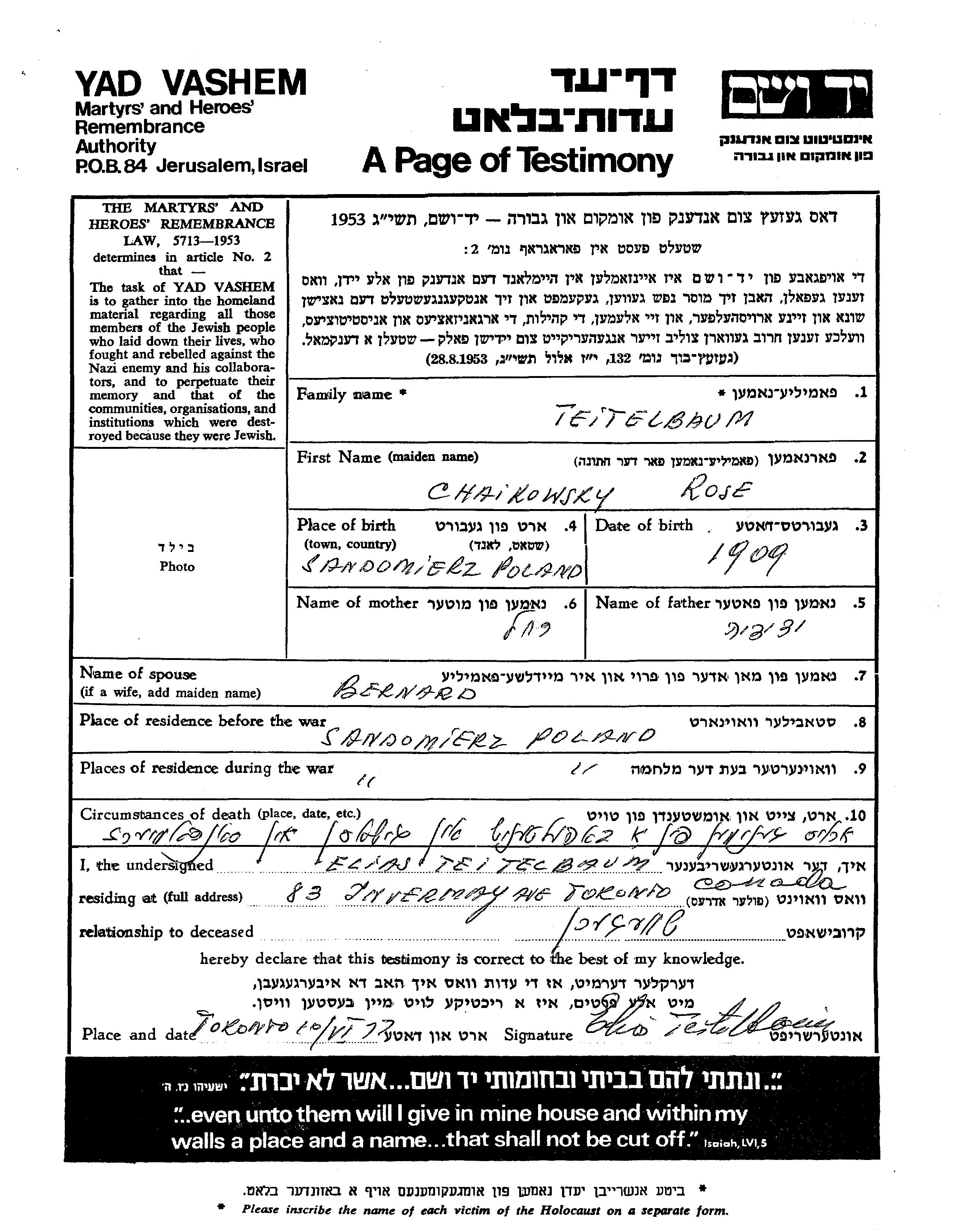 Rose Teitelbaum, geb. Chaikowsky wurde im Jahr 1909 in Sandomierz, Polen geboren. Sie war die Tochter von Yedidia und Rakhel. Vor dem Zweiten Weltkrieg lebte sie in Sandomierz, Polen. Während des Krieges war sie in Sandomierz, Polen.