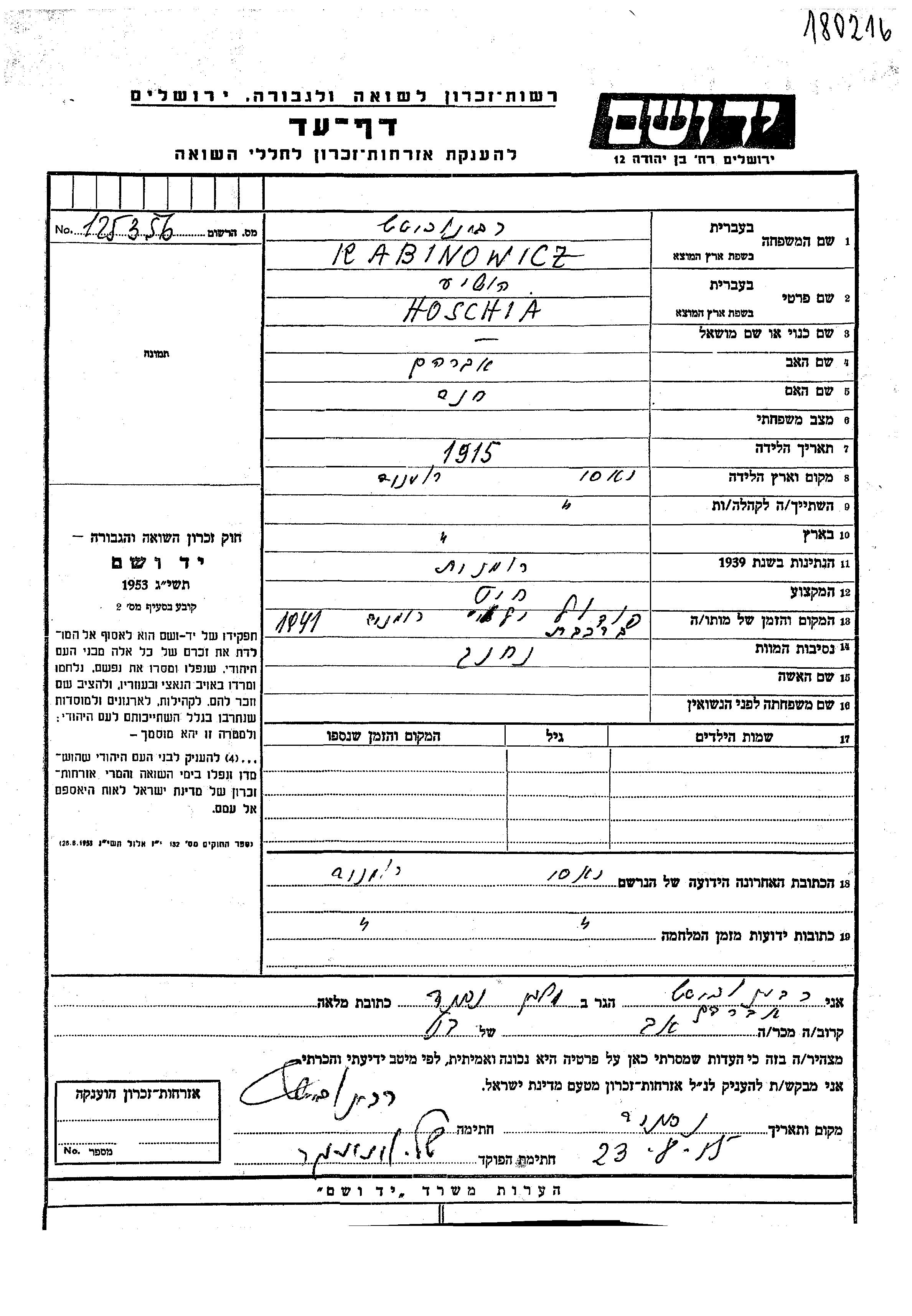 Hoschia Rabinowicz wurde im Jahr 1915 in Jassy, Rumänien geboren. Er war der Sohn von Avraham und Khana. Er war Schneider. Vor dem Zweiten Weltkrieg lebte er in Jassy, Rumänien. Während des Krieges war er in Jassy, Rumänien.