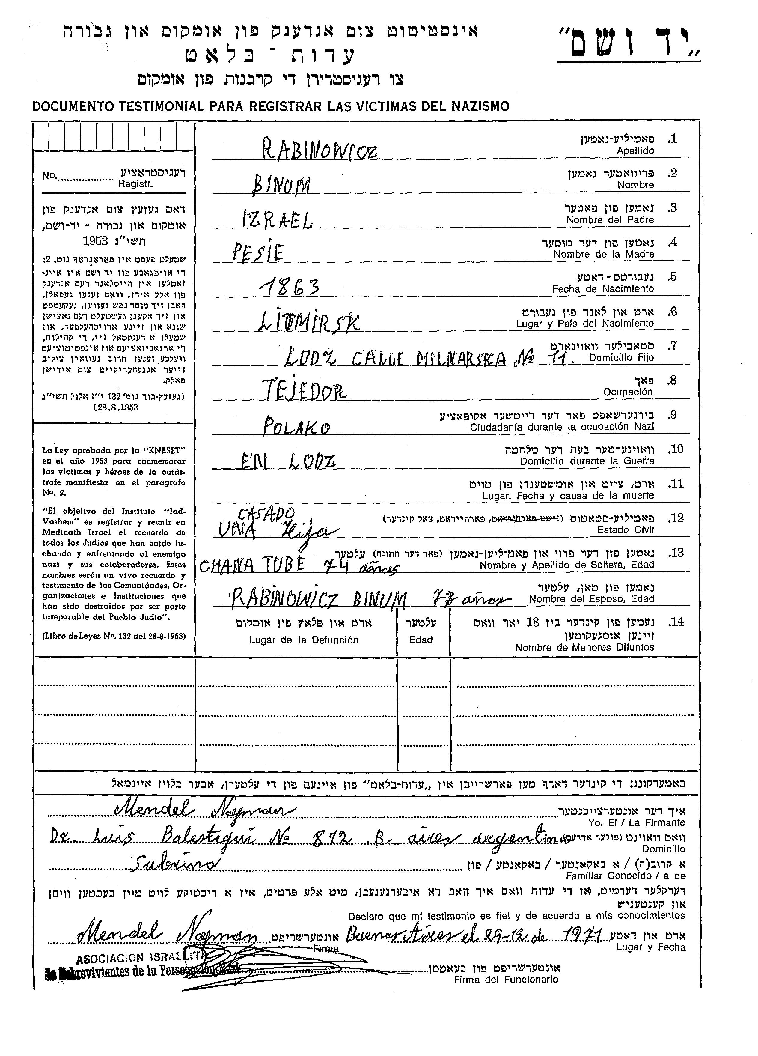 Binom Rabinowicz wurde im Jahr 1863 in Lutomiersk, Polen geboren. Er war der Sohn von Israel und Pesie. Er war Tejedor und mit Chana Tube Verheiratet. Vor dem Zweiten Weltkrieg lebte er in Lodz, Polen. Während des Krieges war er in Lodz, Polen.