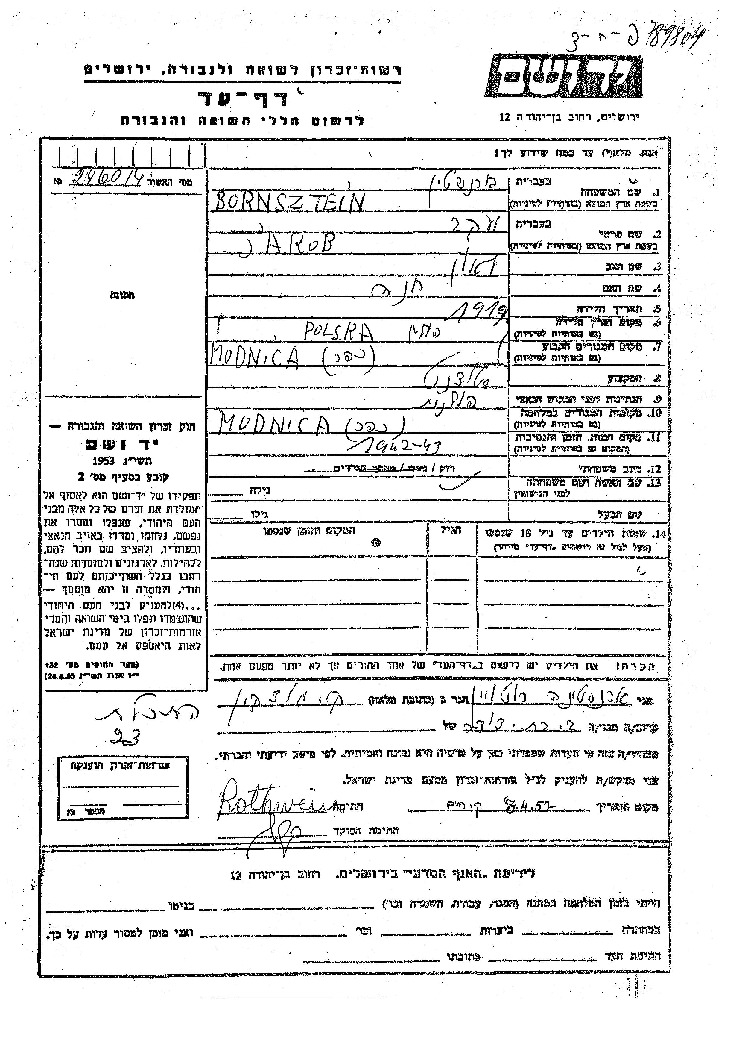Bornsztein Jakob 1919 Modlnica, Polen Gedenkblatt